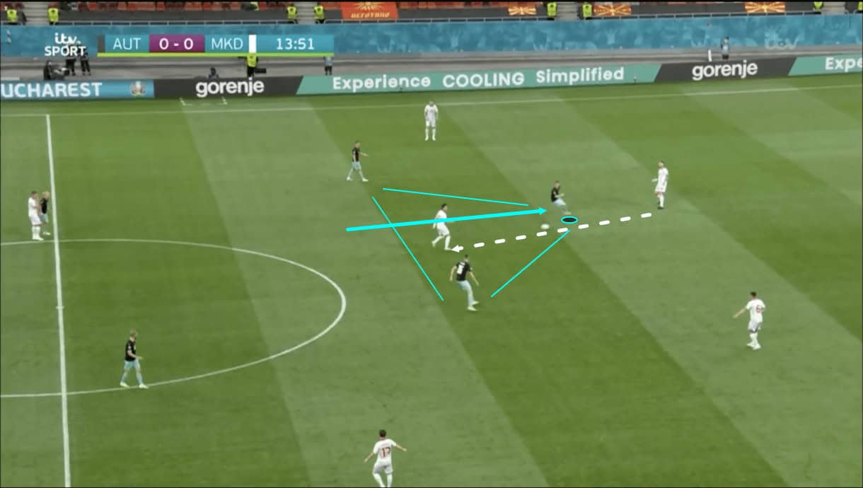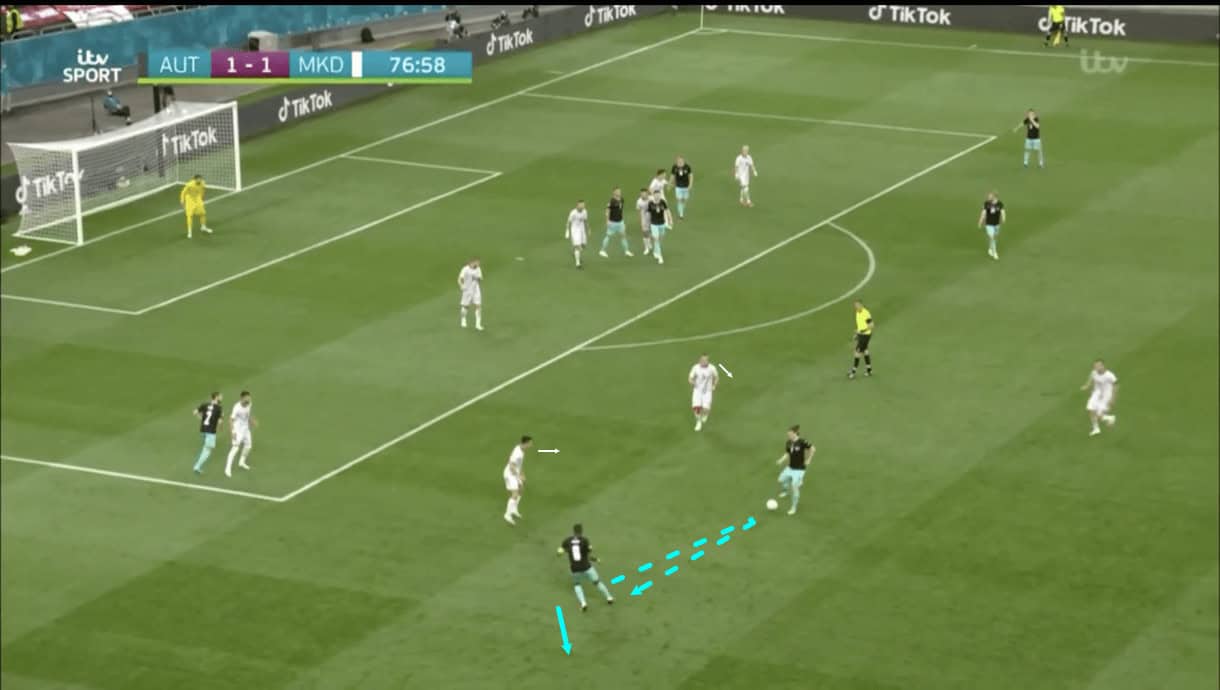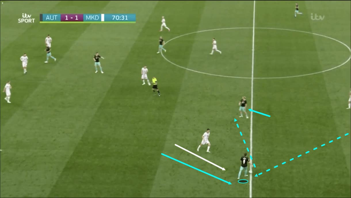 This shows how Sabitzer’s role in the left half-space created a dilemma that North Macedonia had no answer for. If Sabitzer was free, he could use his technical quality to progress the ball himself, but if he was pressed like in figure 7, then Schlager could progress play, as North Macedonia didn’t press as a unit, failed to remain compact and allowed Austria to open them up in the centre.