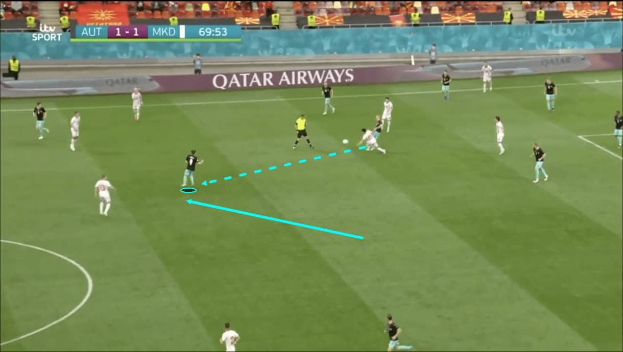 Similar to when he occupied the deeper left half-space during ball progression, Sabitzer tended to enjoy too much time and space in this more advanced left half-space position as a result of North Macedonia’s wide midfielders not wanting to press too aggressively and allow gaps to open further up the pitch. North Macedonia were quite passive, defensively, in this game and were generally happy to sit deep and compact, aiming to keep Austria at a distance and prevent them from playing through the centre.