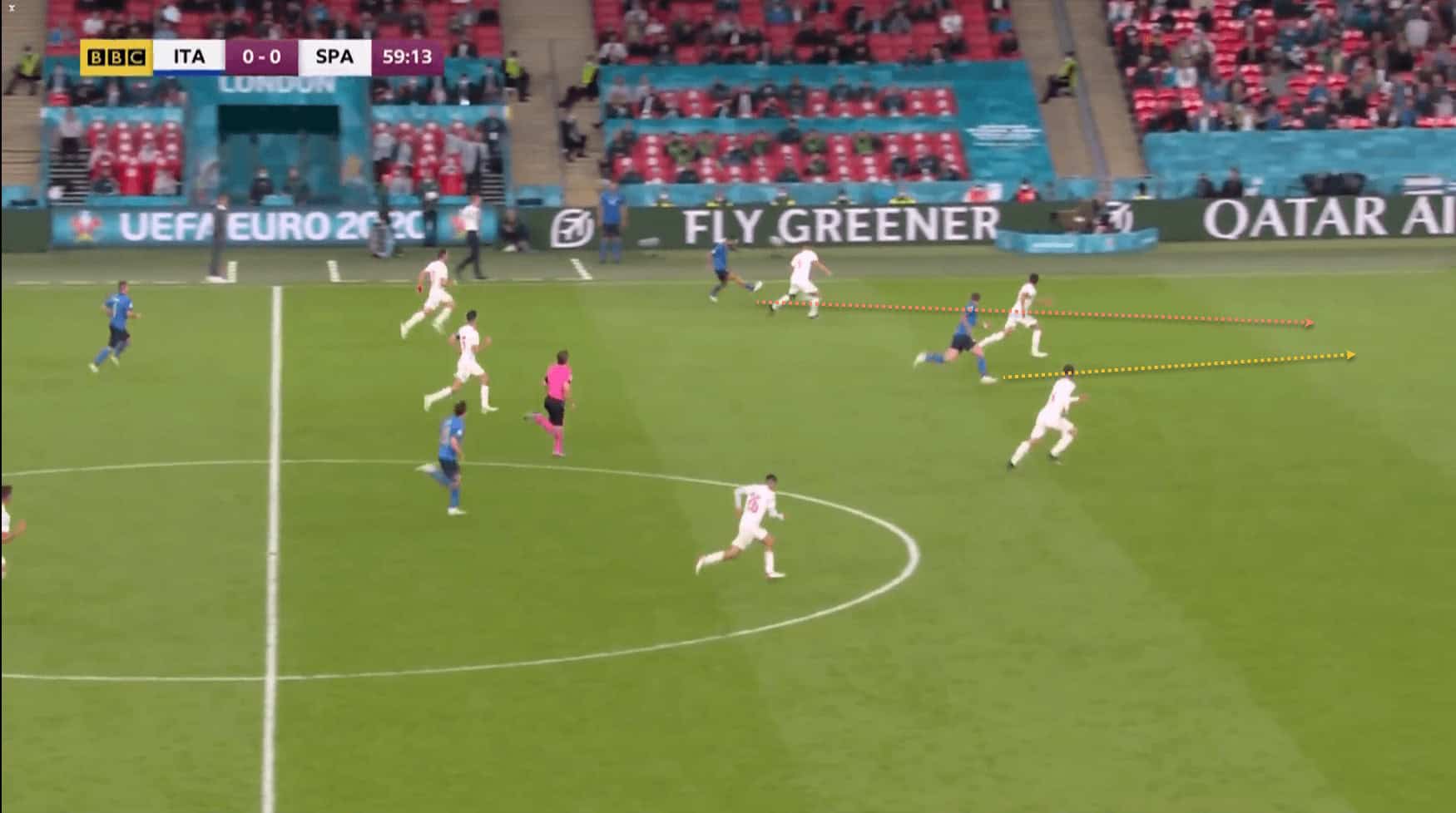 Here, Olmo drops off into midfield, and his presence means that Koke is unmarked, allowing him to receive possession easily when Olmo plays the ball to him after receiving it from Eric Garcia. Also note how Federico Chiesa has been drawn infield from the right flank to pick up Pedri here, as Spain would have a numerical overload in midfield instead – however, this has the effect of opening up space on the left for both Jordi Alba and Ferran Torres, another theme that would occur repeatedly throughout the match.