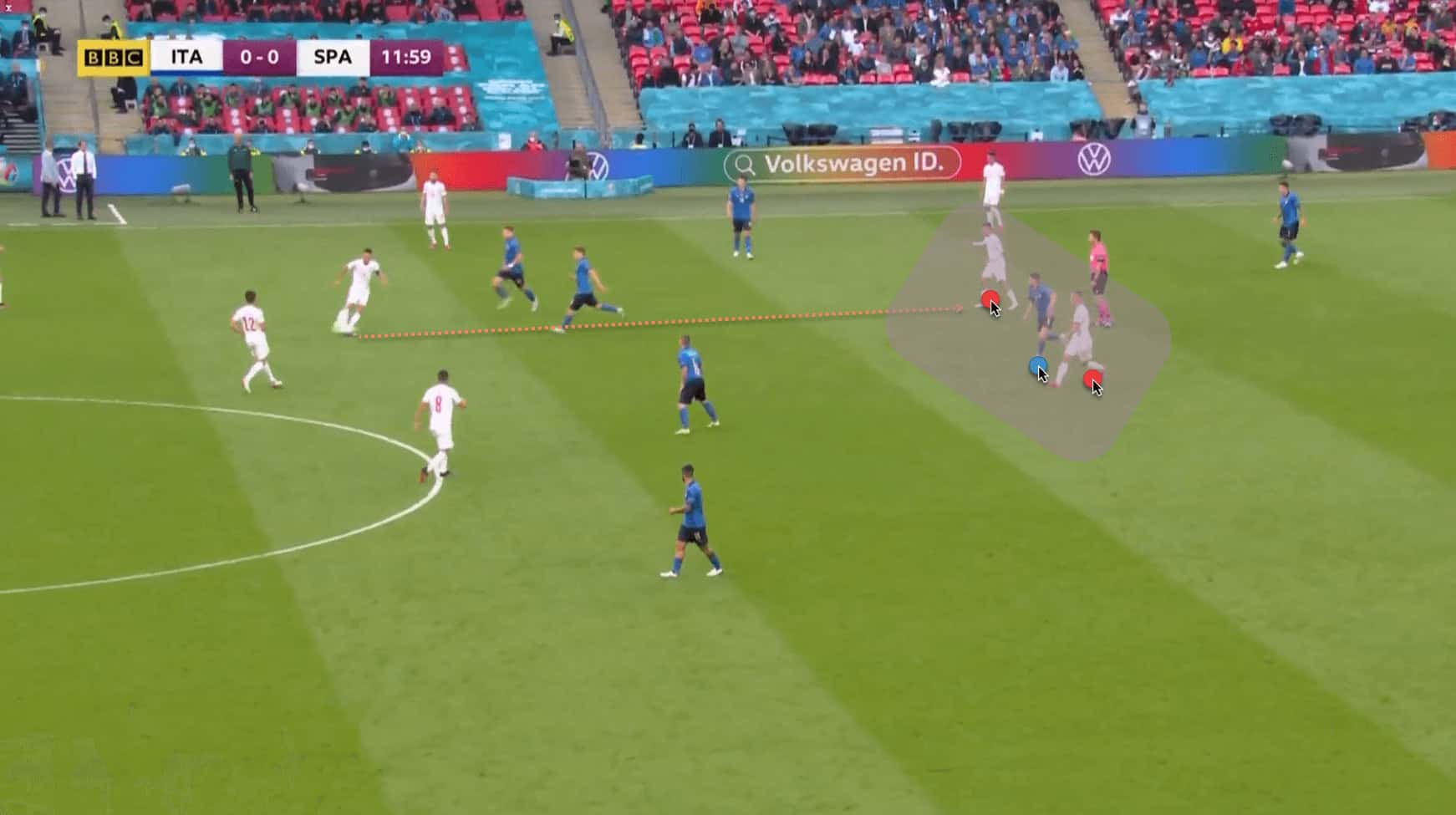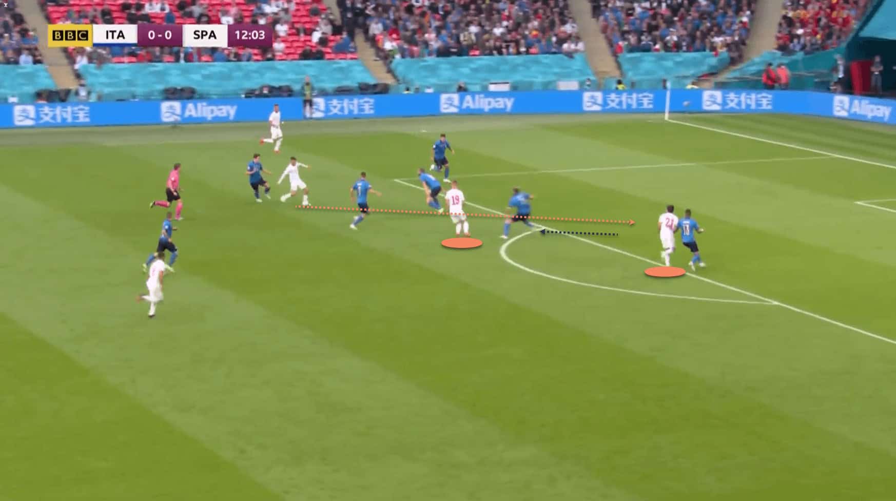This is in the build-up to one of Spain’s best opportunities of the match – note how Olmo and Pedri are both in Jorginho’s zone here, overloading him and making it easy for Sergio Busquets to find either player with a pass through the lines – in this case Pedri, since Jorginho is closer to Olmo.