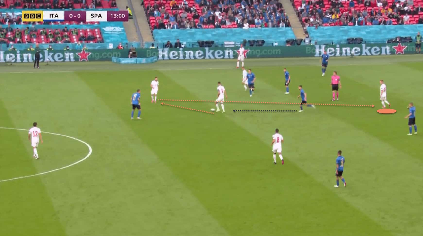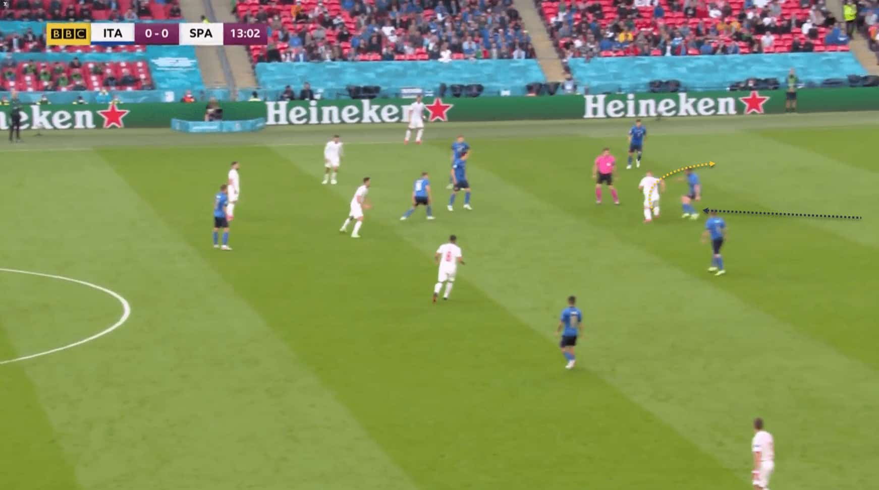 Spain completely dominated the first half of this match, and Dani Olmo was a big reason for this. With Georgio Chiellini and Leonardo Bonucci at the heart of the Italian defence, Enrique opted against using a traditional striker up front – instead, Olmo played as a roaming forward who was frequently dropping deep and playing in the half-spaces, in front of the Italian centre-backs. This meant that the two Italian centre-backs often did not have a direct opponent to mark, and one of them would have to step up to pick up Olmo or another Spanish player – something neither player is especially comfortable at. Olmo’s positioning also helped Spain create numerical overloads in midfield which allowed them to progress quite easily into the final third.