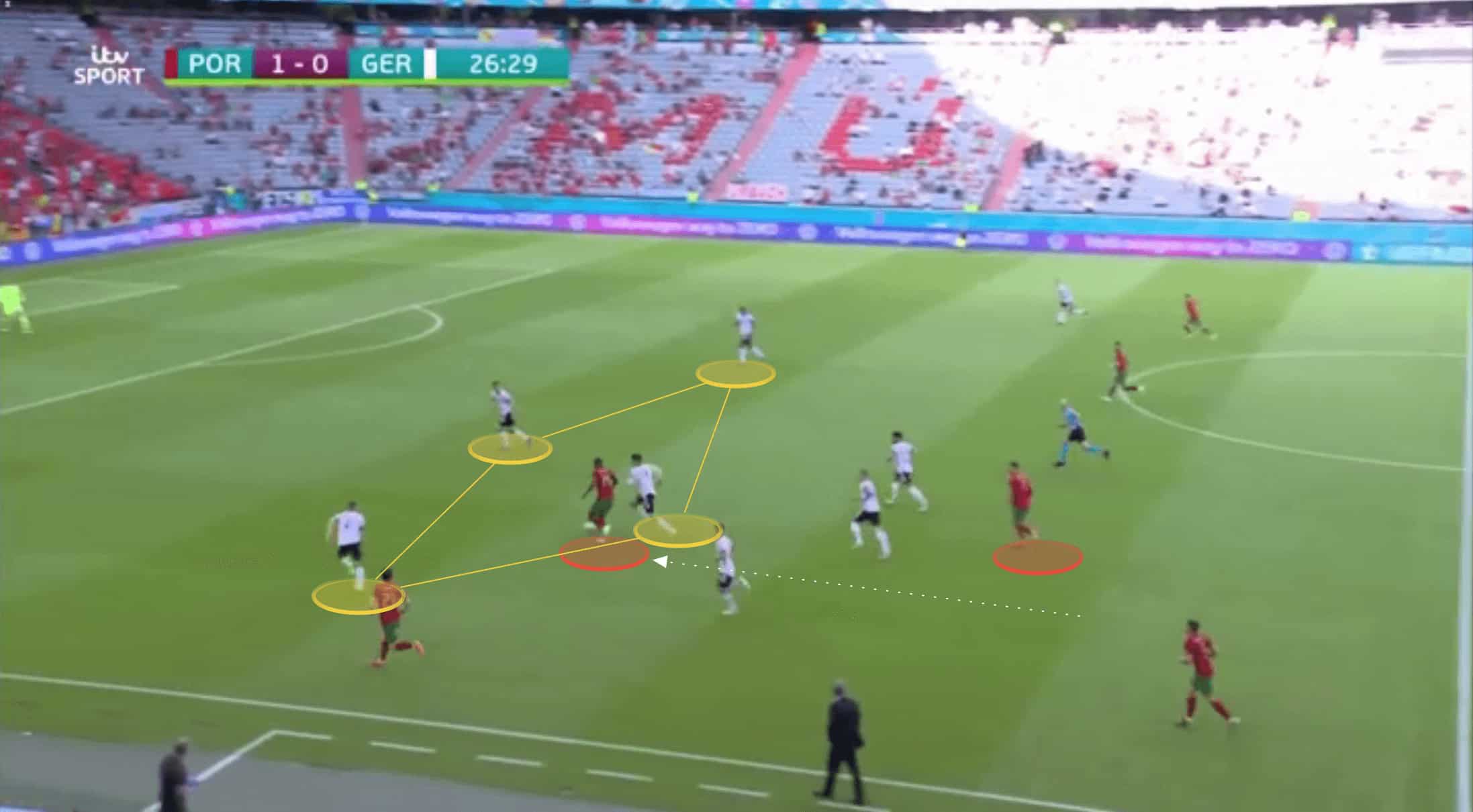 Portugal conceded possession to Germany, taking just a 41.72% share of possession on the day. It was clear from the word go that they intended to hurt the Germans on transition. This won’t be the only time Germany are targeted in this way in this tournament. With a midfield duo of Ilkay Gundogan and Toni Kroos, whilst outstanding ball players, neither are particularly known for their defensive work. With Gosens and Kimmich playing as wing-backs there will be space to hit in behind on the counter against that back three of Antonio Rudiger, Mats Hummels and Mathias Ginter. When you look at the players in this German starting XI, it makes sense to look to hurt them on the break with direct attacking play.