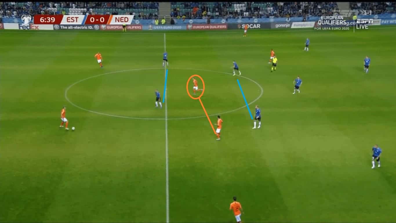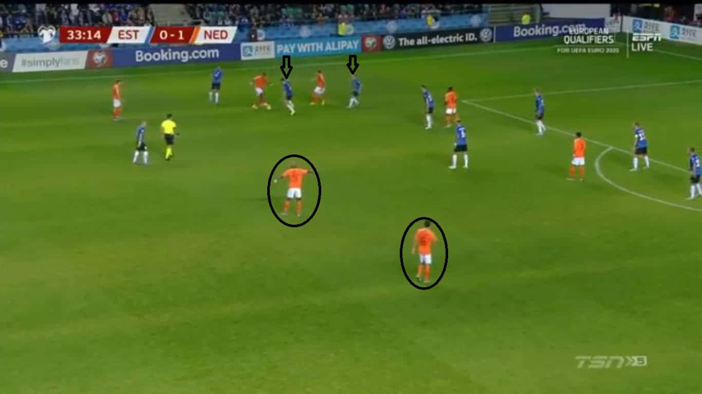 Estonia, understanding the gulf in quality between the two sides, opted for a deep-block. The home side sought to crowd the midfield and have all their outfield players contribute defensively. As a result, although they lined up in a 4-1-4-1, this effectively became a 5-4-1 when Estonia conceded possession. Both the wingers were tasked with helping their defensive counterparts against the Dutch attacks from the wings. However, Estonia’s deep-block was rendered ineffective by the intelligent Dutch passing as well as some poor defending on the home side’s part.