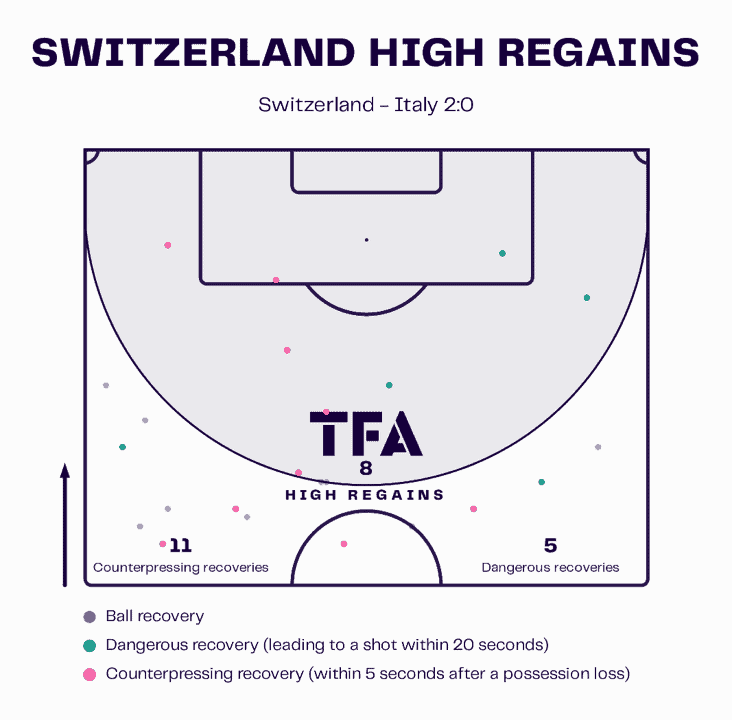 These numbers aren’t reflective of a high-intensity pressing team. And that is exactly the point we’re trying to make here – Switzerland pick their moments to up the pressure, and, as we discussed, it’s usually in transitional moments. More often than not, those counterpressing moments come in central areas for Switzerland as they can have a stronger presence in those areas without leaving themselves too exposed in other areas.