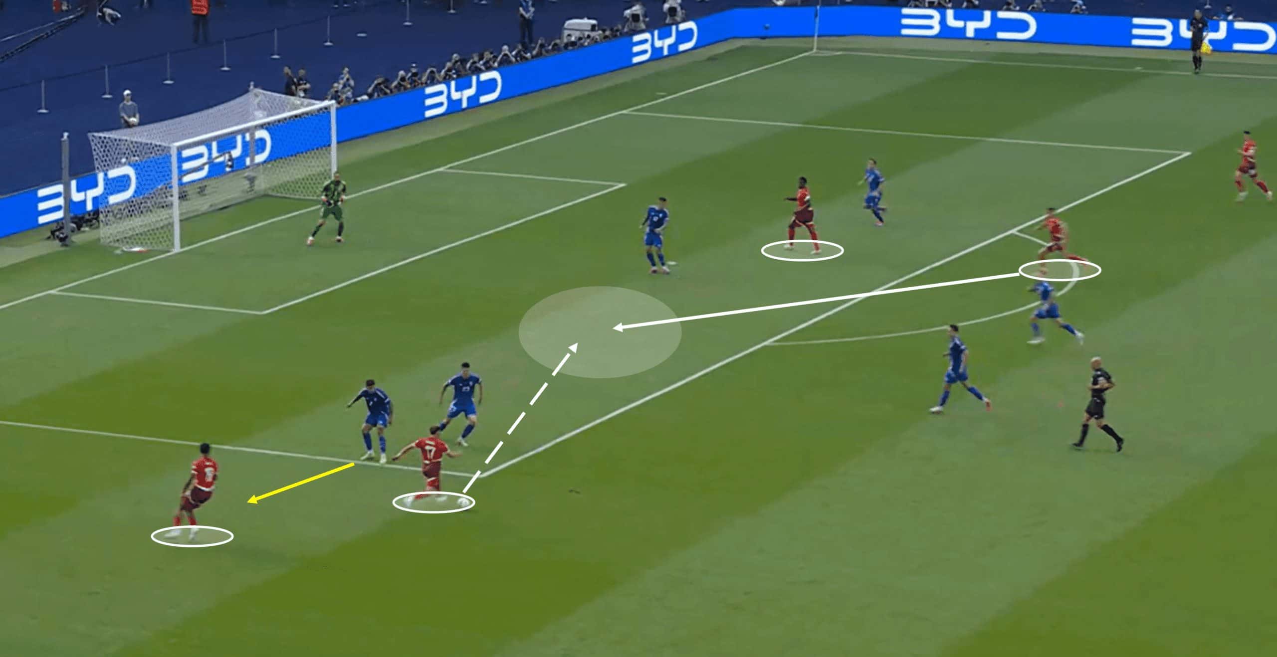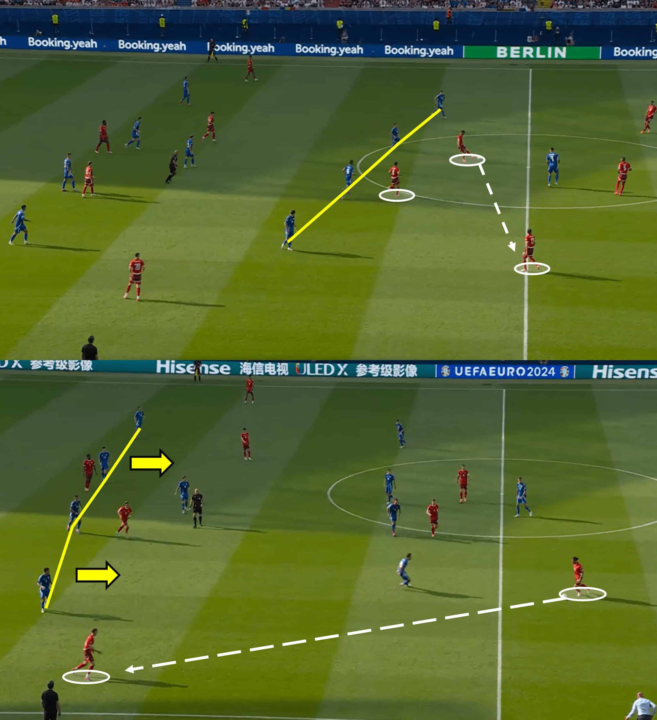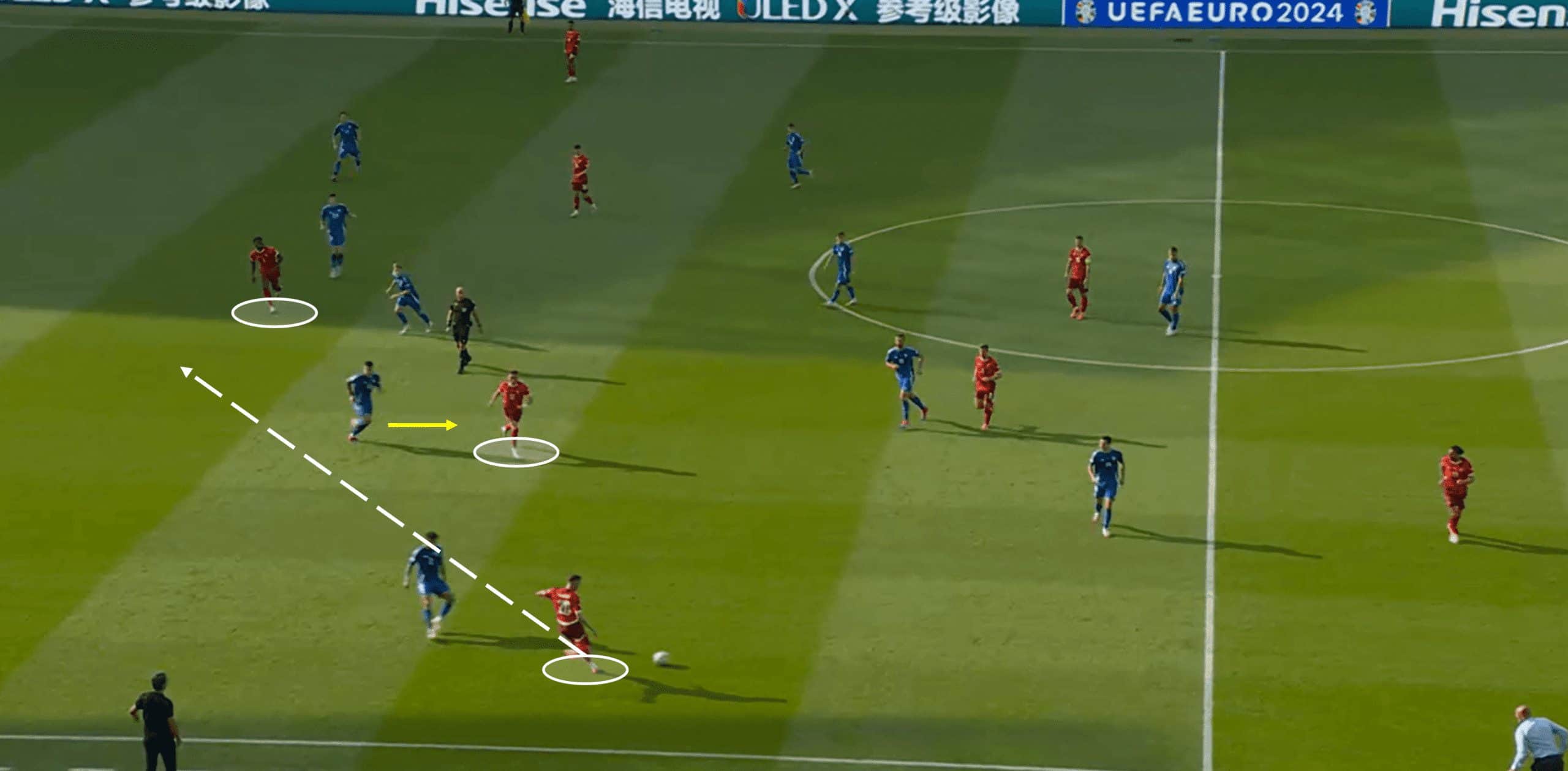 You may recognise the shot above, as it came just seconds before Switzerland took the lead. The attack was the pinnacle of a well-executed attacking transition, which included a quick line-breaking back from defence that ultimately enabled the Swiss to wind up in the position in the image above. From there, they rely on clever individual movement and a quality end product.