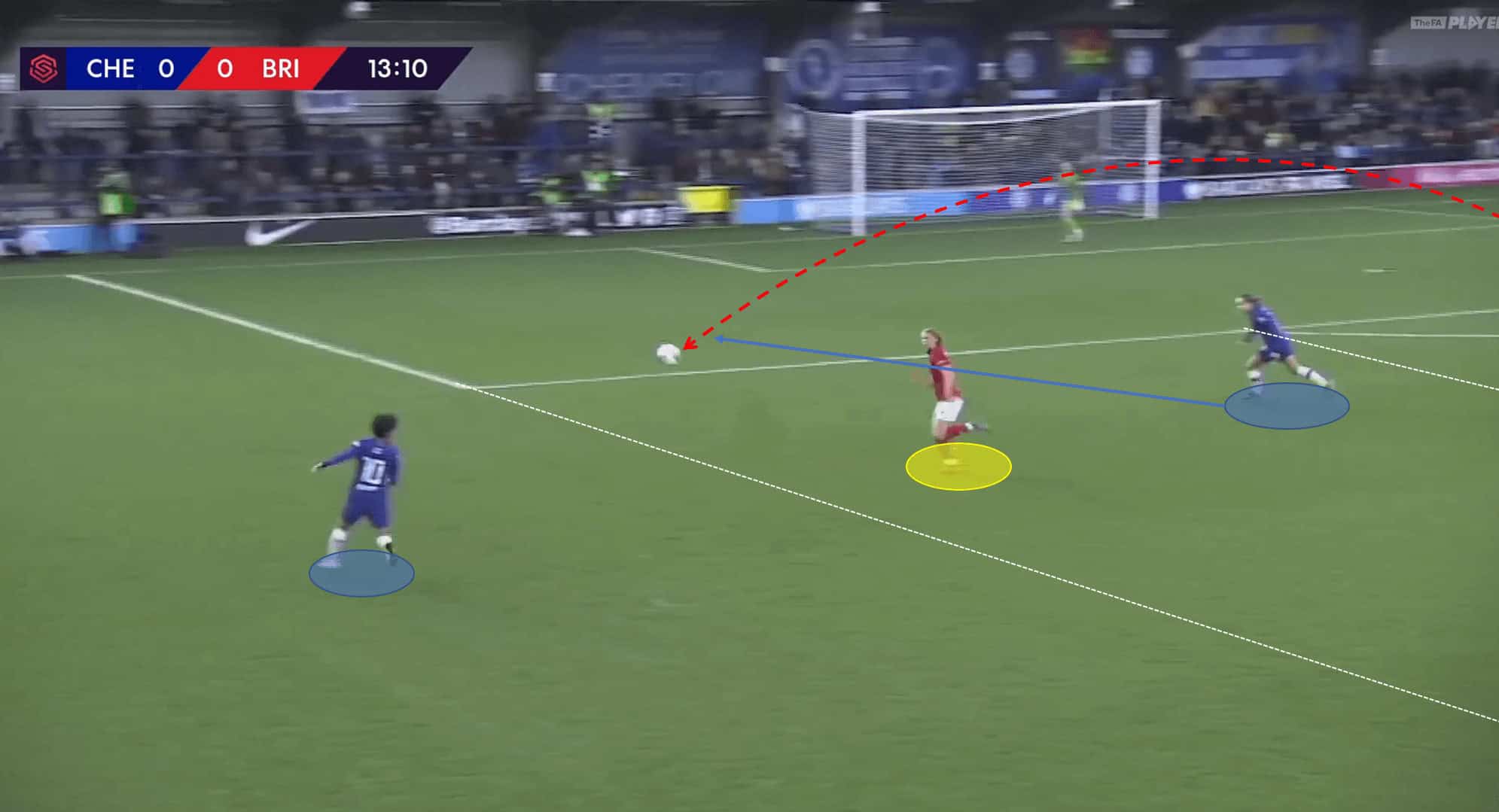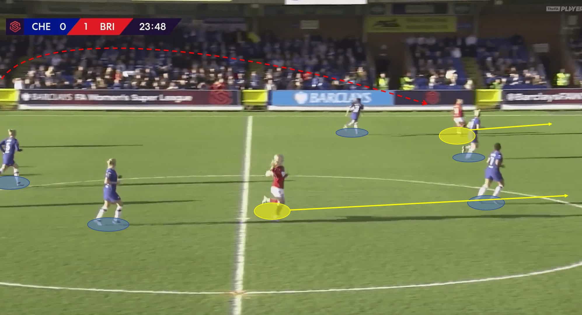 When gaining the ball Bristol City sought to immediately play the ball forward into space behind the Chelsea defensive line. Chelsea typically play with a high defensive line and Bristol City manager Tanya Oxtoby aimed to exploit this vast amount of space with aggressive runs from 18-year-old strikers Elise Hughes and Ebony Salmon.