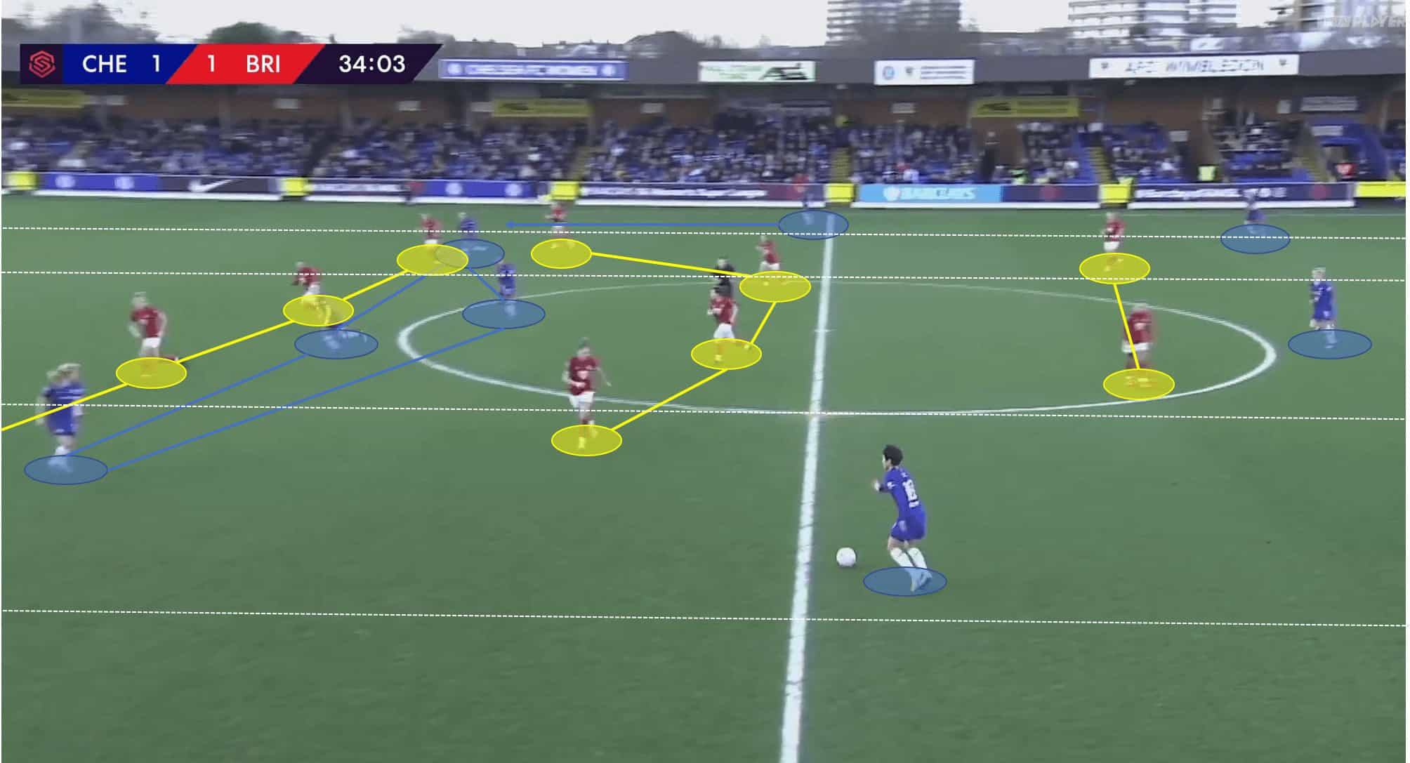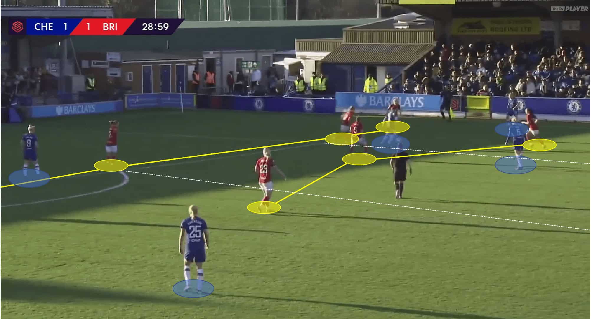 A consistent tactic that has developed throughout the current FAWSL campaign is Chelsea’s use of positional play tactics. Hayes seeks to allocate a consistent attacking structure throughout a match but offers the flexibility of player interchanges within the structure. This leads to Chelsea players taking up advantageous positions in attacking phases of the match, but the players in each position could be different each time.