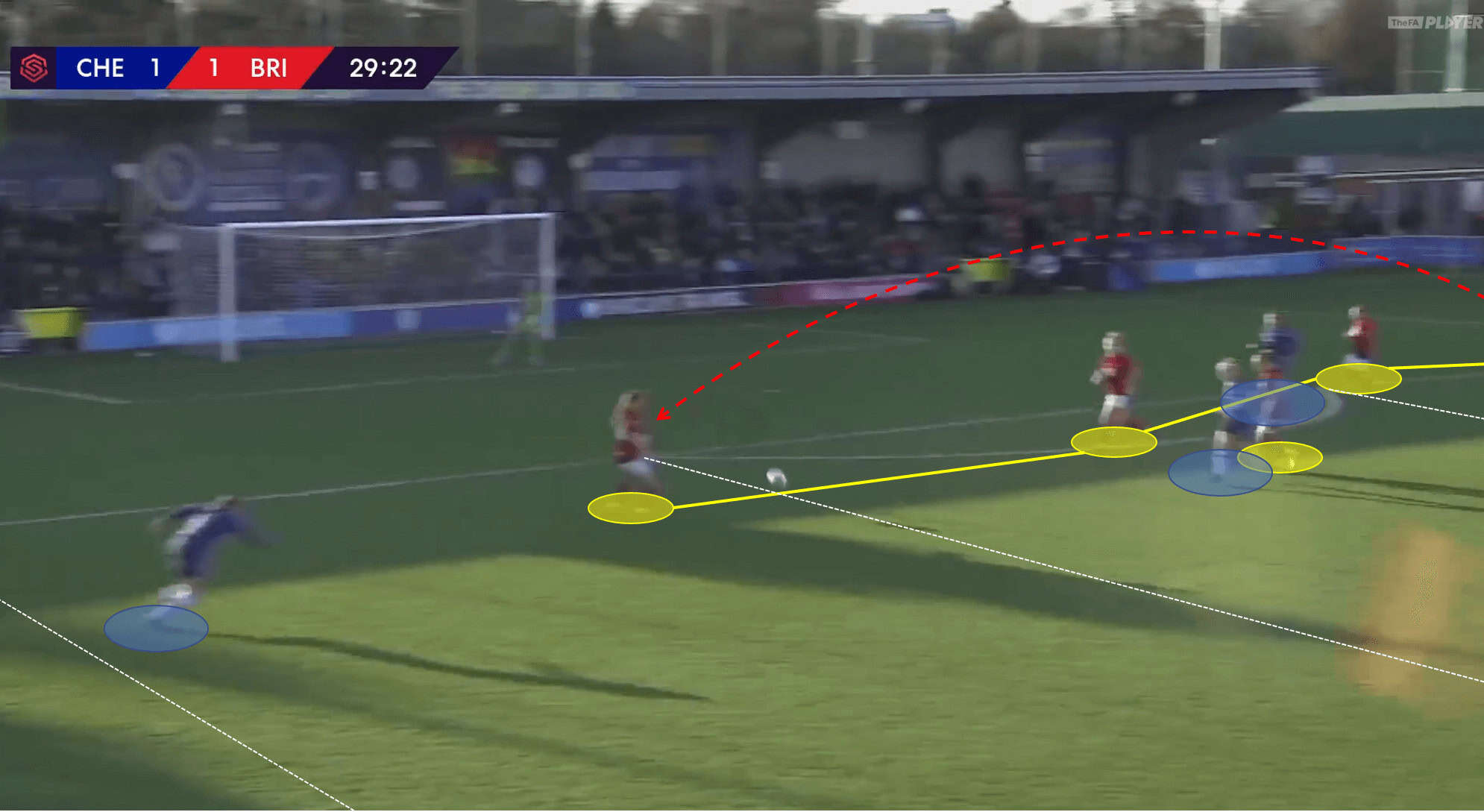 Once most of the Bristol block has been drawn to the right side of the pitch, Chelsea play the ball backwards to Sophie Ingle who is waiting in the right halfspace. Ingle immediately plays a diagonal cross to the left flank.