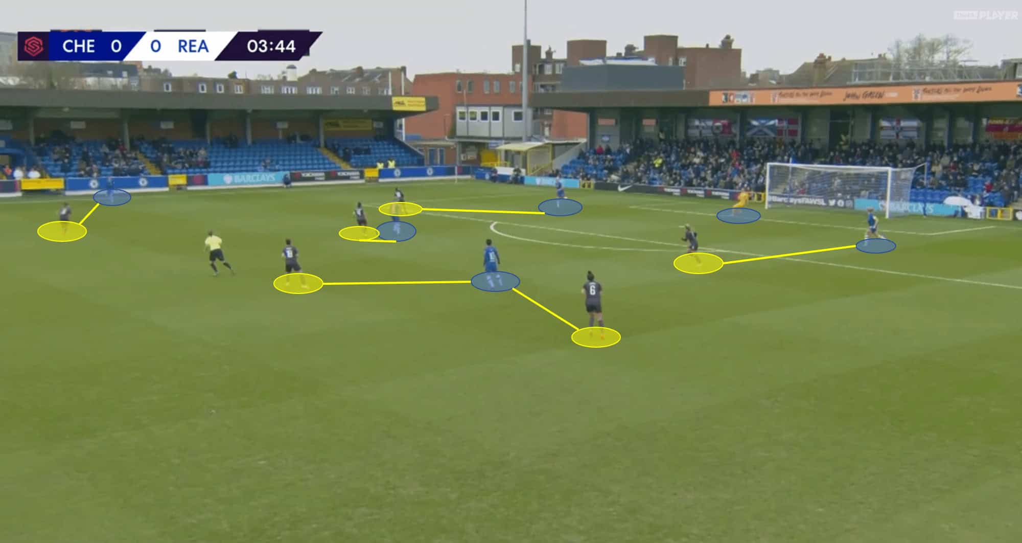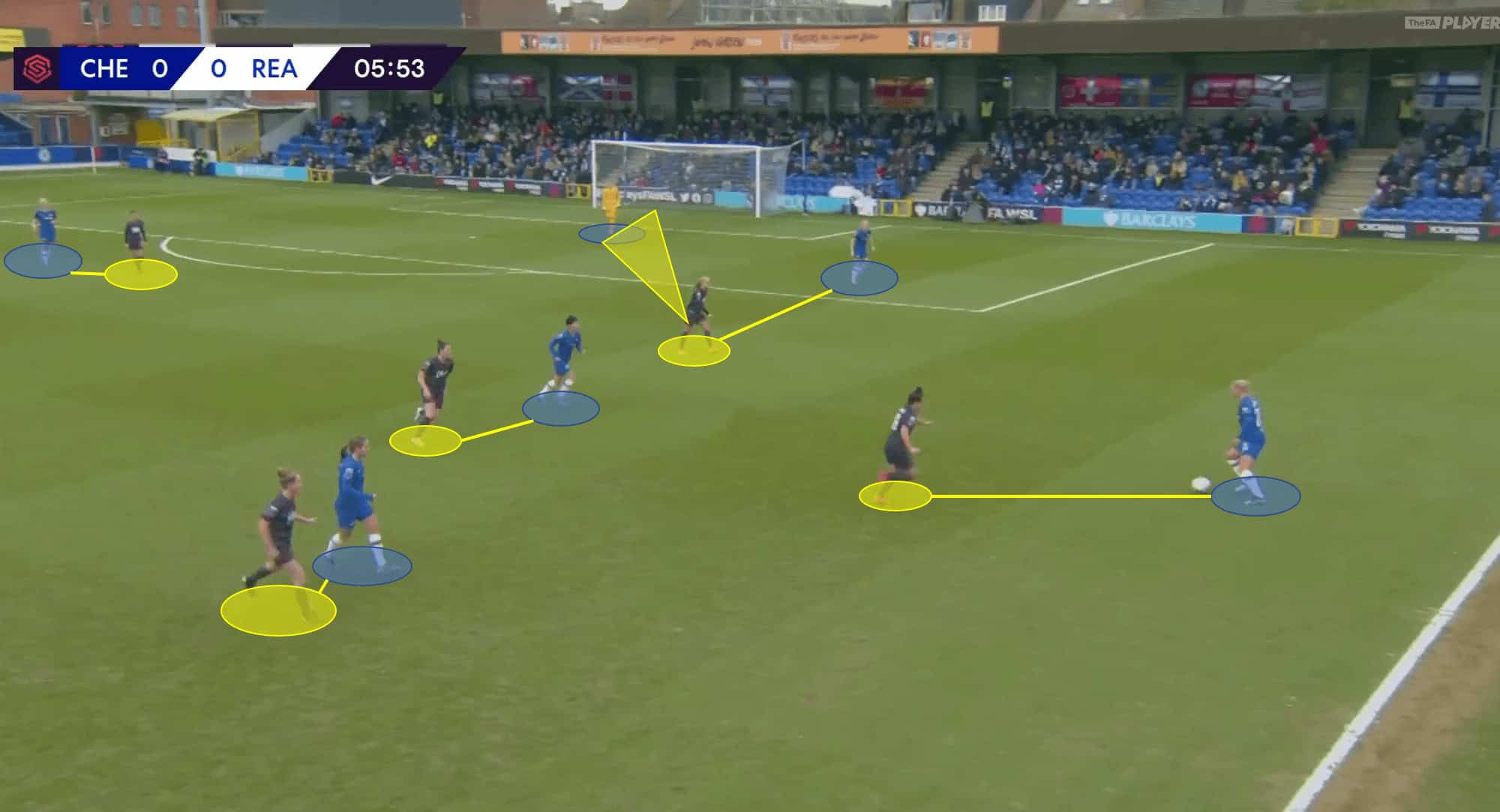 The Reading midfield diamond also pushes up, with the central midfielders covering both central space and eliminating Ji So-yun and Sophie Ingle as safe passing options. The Reading outside midfielders (Remi Allen and Angharad James) remain in the halfspaces to both maintain numerical superiority in the central area and encourage passes out wide to the Chelsea fullbacks.