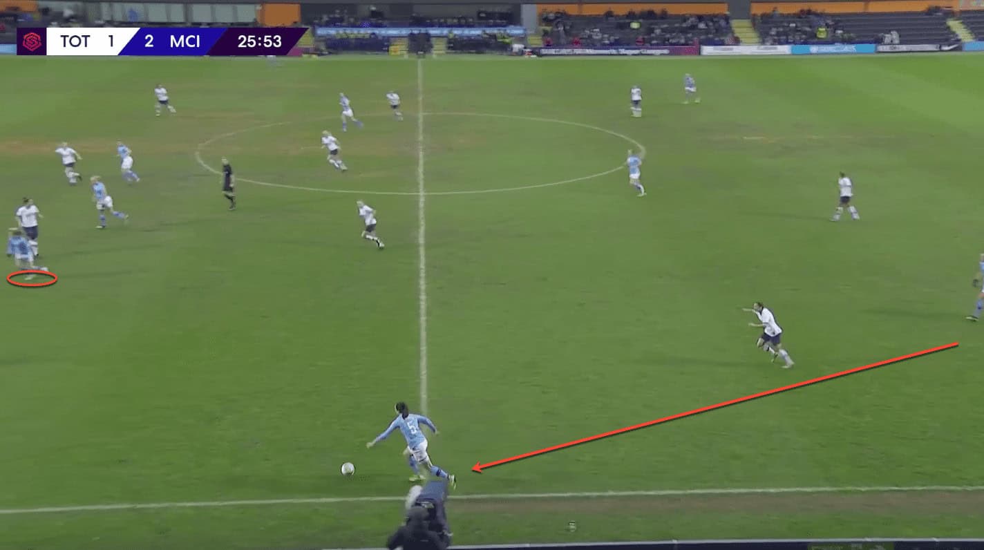 As soon as the pass is played into the left-back, the forward line pushes forward looking to expose space behind the Spurs backline. Campbell takes a touch and finds a pass down the line into Hemp running through the halfspace. The winger receives the pass and crosses back towards the edge of the box that finds Bremer for the first time finish. City were on top form throughout this match. Their expected goals for this match came out to 3.8, and while their tally slightly bettered this statistic, they could have scored a lot more.