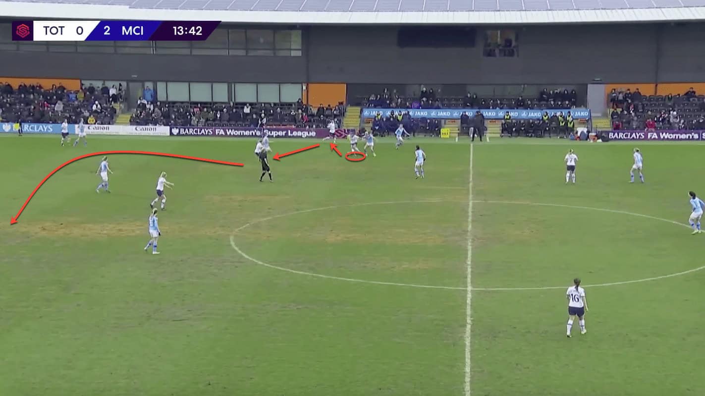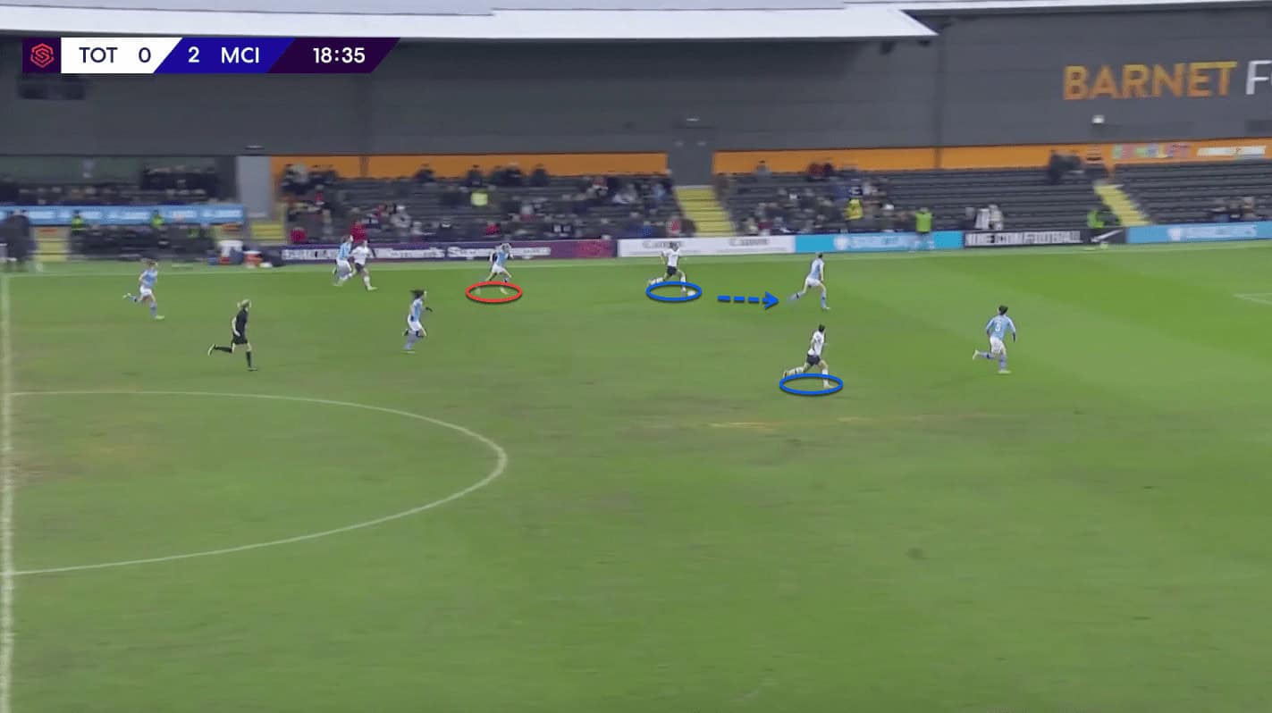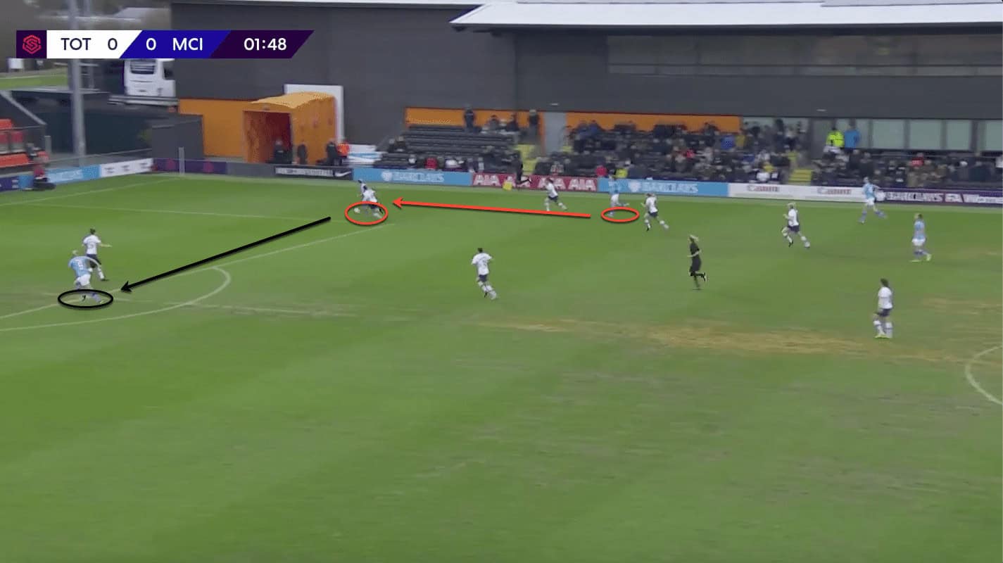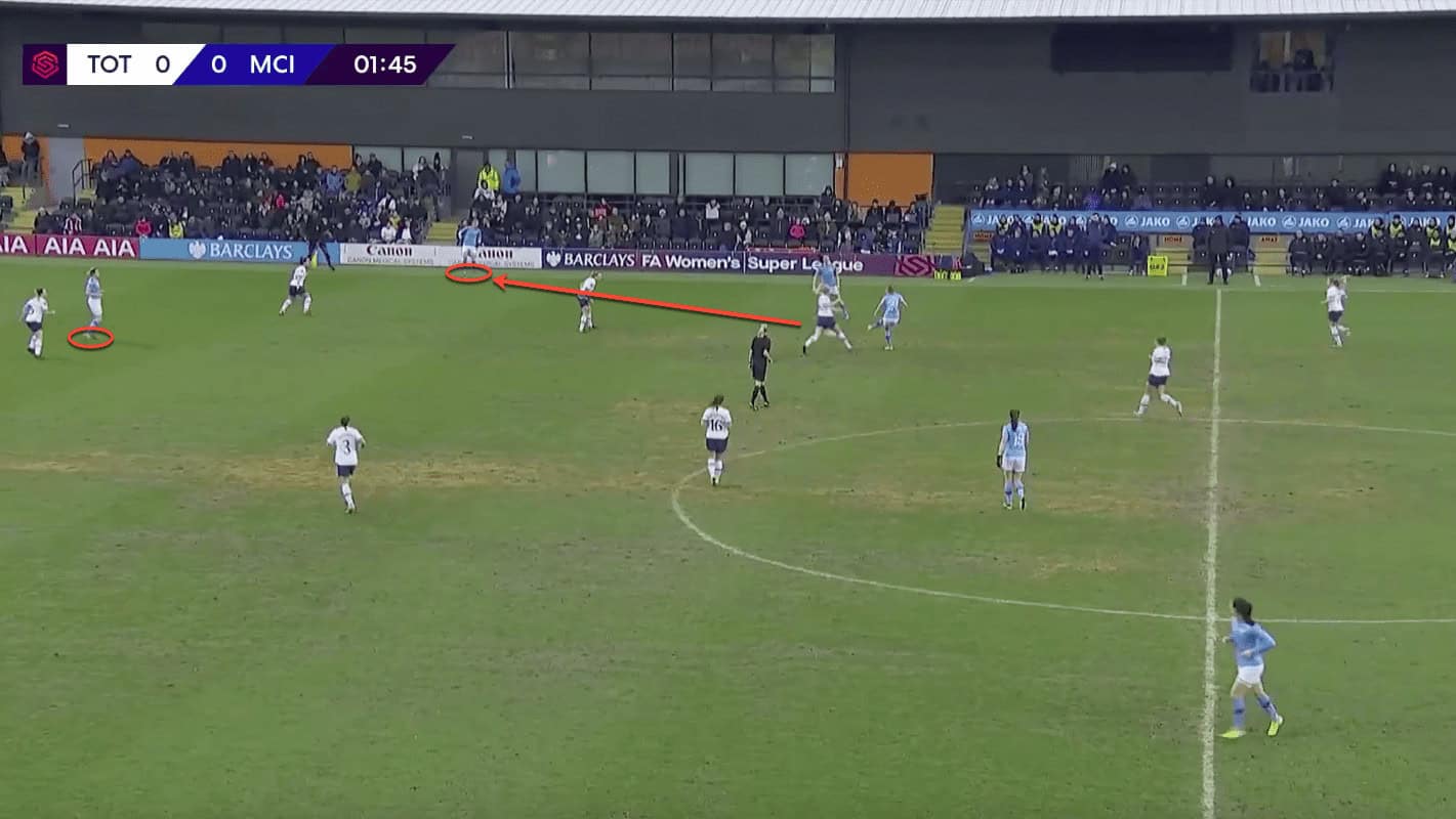 Neville was forced into doing exactly what City were hoping for. When Spencer receives the pass, she is given no option but to kick it long. Houghton wins the header and City gain possession again to start their attack from their initial build-up. This high press prevented Tottenham Hotspur Women from ever getting fully comfortable in possession. City recovered possession a whopping 81 times in this match.