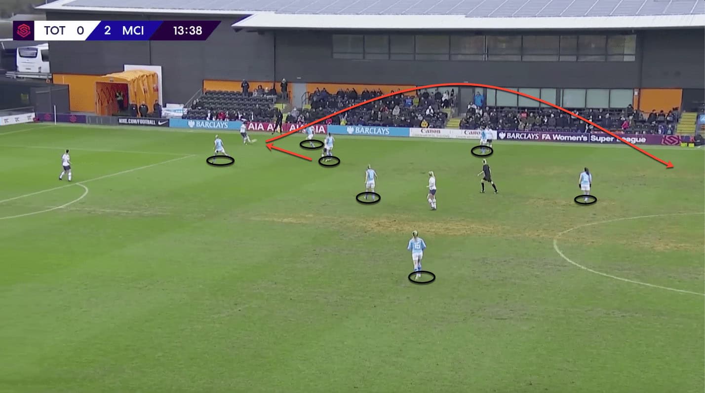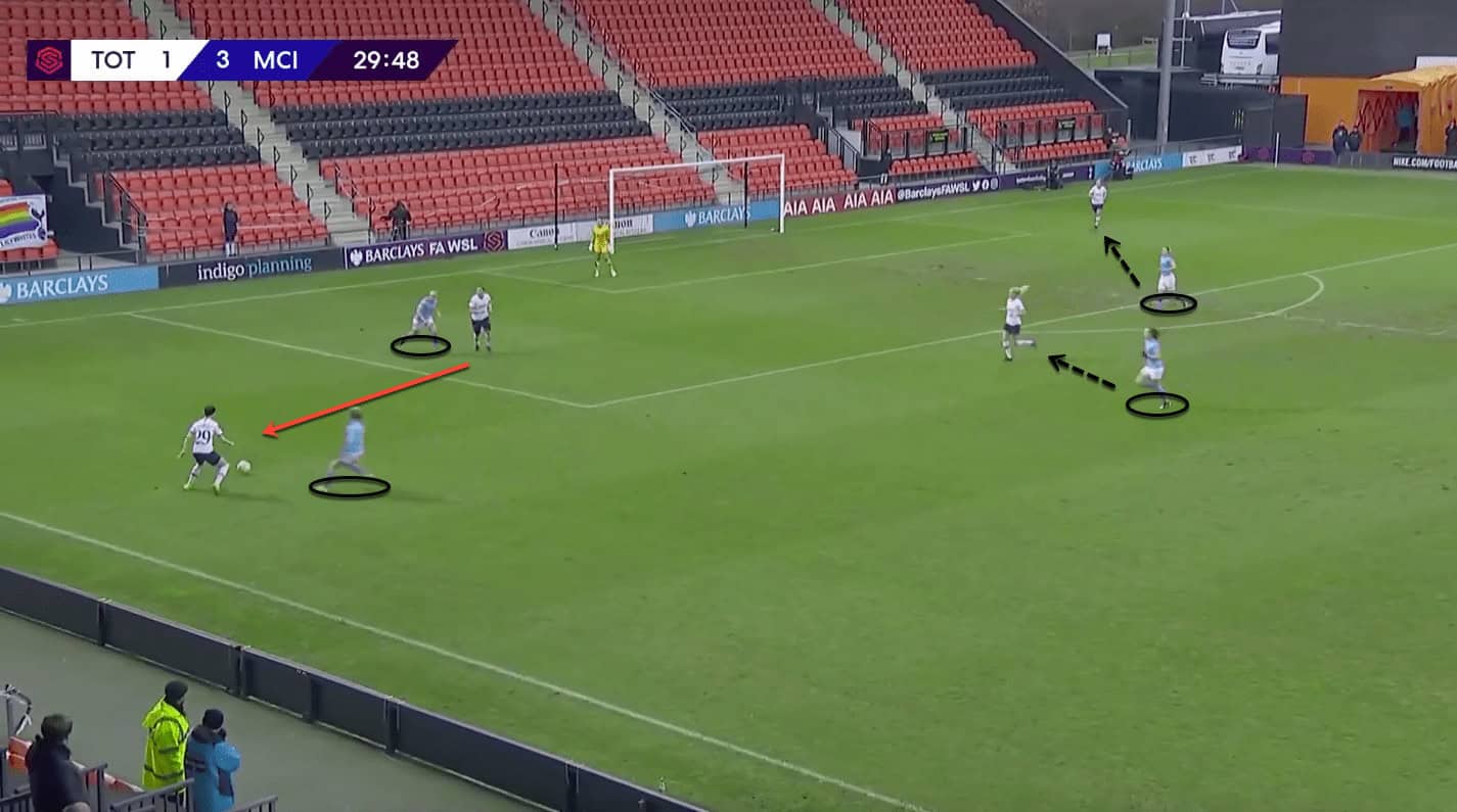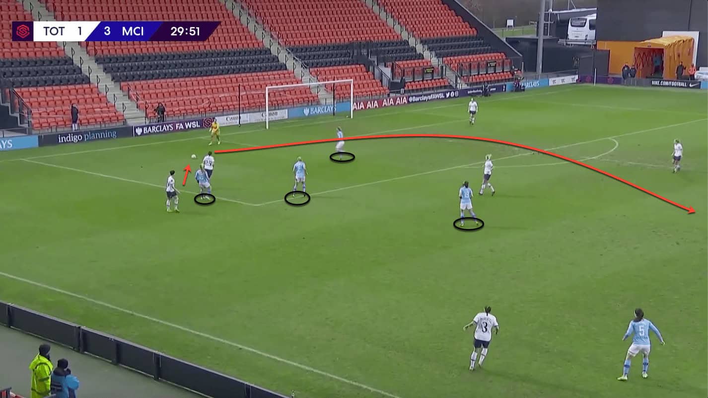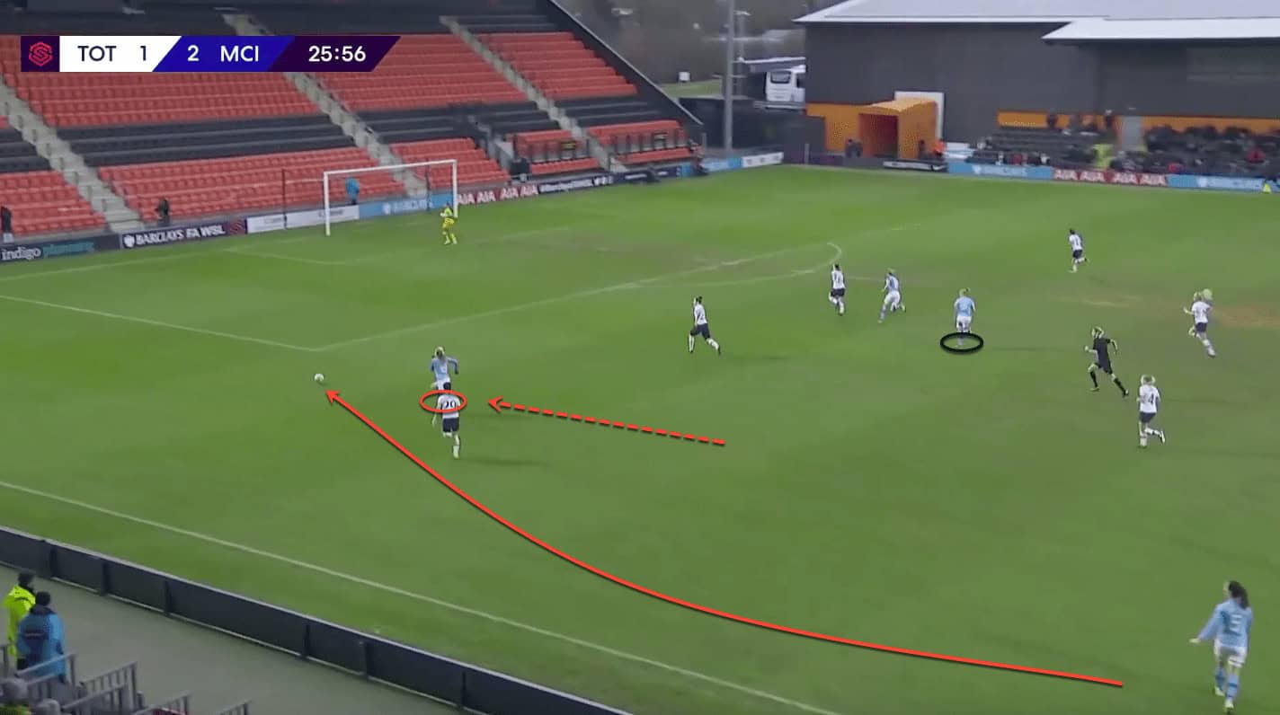 Neville was forced into doing exactly what City were hoping for. When Spencer receives the pass, she is given no option but to kick it long. Houghton wins the header and City gain possession again to start their attack from their initial build-up. This high press prevented Tottenham Hotspur Women from ever getting fully comfortable in possession. City recovered possession a whopping 81 times in this match.