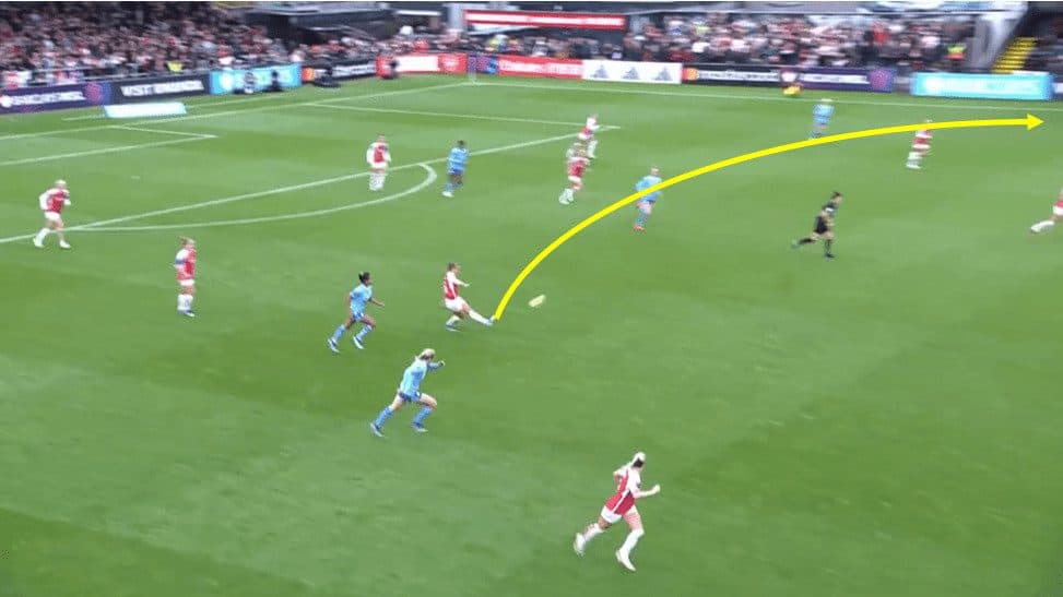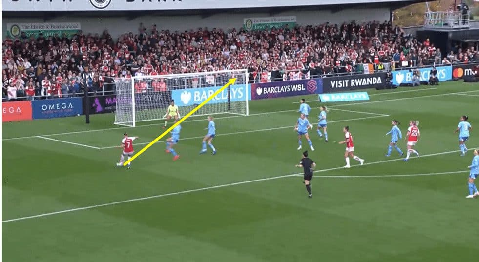 In this above example, Arsenal have won the ball deep in their own half following some City possession. All that’s going to happen is McCabe launches a ball over the top of the City defence for the speedy substitute Blackstenius to run onto. She can get in behind the City defenders, beating them for pace. Then Keating comes off her line and misjudges the bounce of the ball and is unable to clear it, and Blackstenius has an open goal in front of which she can finish off and score the winner for Arsenal.