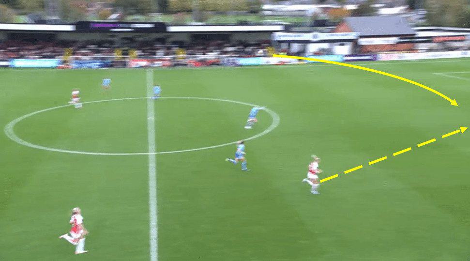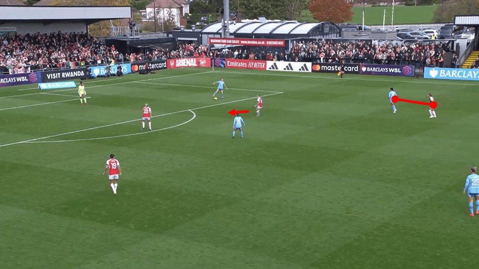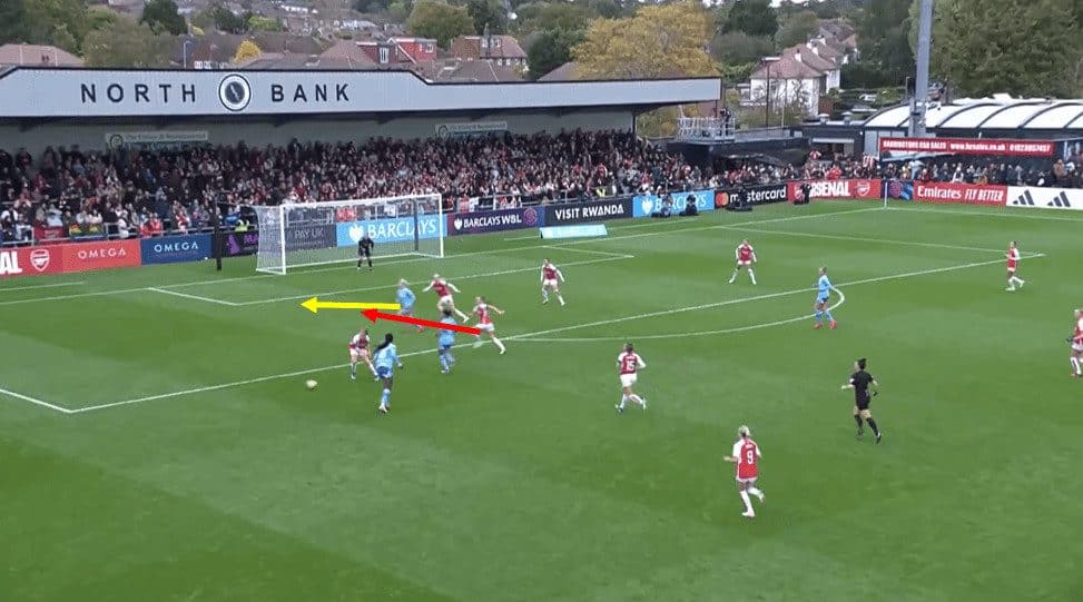 The above scenario leads to the opening goal of the game. To provide some context, Arsenal have just won a freekick around halfway. Arsenal take this freekick quickly and note how narrow the entire City team is, with all this space available on the left flank for Catley to run onto. Foord does well to hold off the backside pressure of defender Esme Morgan and play Catley through on goal, which she can finish well. By not allowing City to reset, they could take advantage of a disorganised City defence and take the lead in the game.