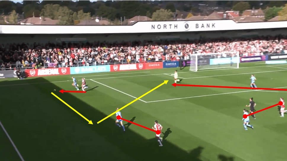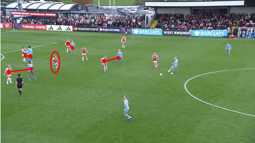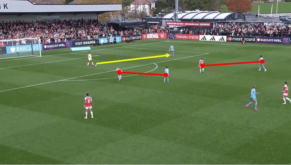 It’s also important to note how Arsenal condensed the middle areas of the field, which forced City to try and play around their shape and into these wide situations where they were confident in their game plan. You can see in the above image how condensed the midfield has become with any penetrating option to a midfielder or to striker Bunny Shaw being blocked off. All eleven Arsenal players are behind the ball, and all players either closely mark a City player or block a passing line. For example, Kim Little’s case, highlighted by the red circle, blocks the passing lane between the ball and striker Bunny Shaw.