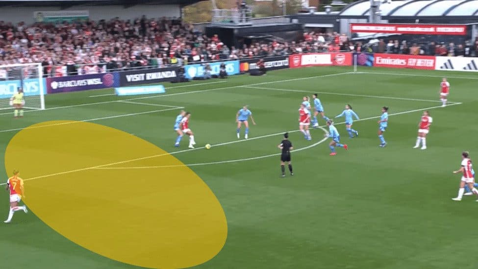 This results in a poor ball into the box, which Lotte Wubben-Moy clears away. Another thing to note is how many Arsenal players are in the box; there are seven against five City players now. Simply by looking at numbers, you would suggest that Arsenal should be able to clear away more balls than if they had even numbers, as they have two spare players.