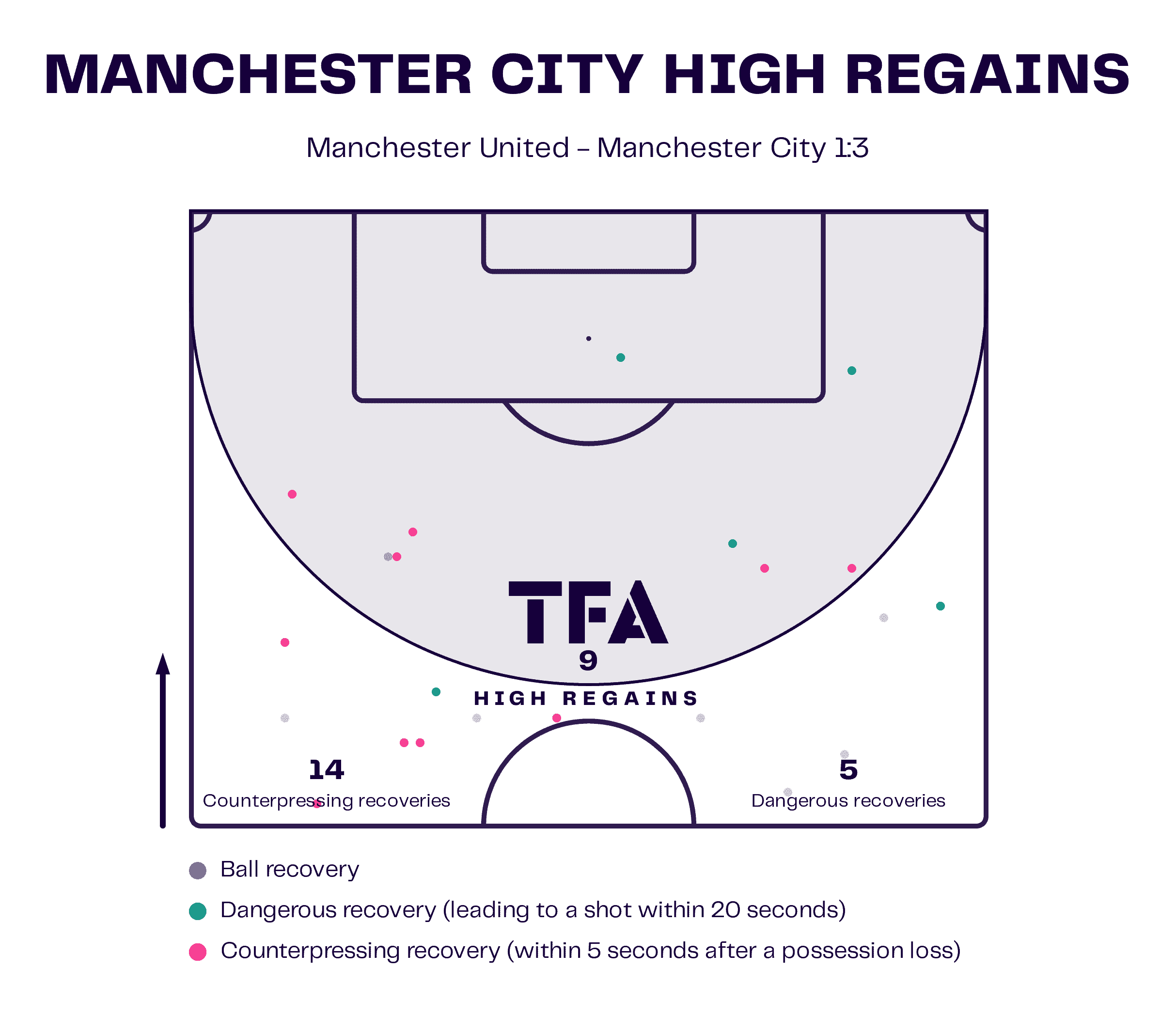 To demonstrate just how fruitful the press was for the visitors, this graphic shows how many times they won the ball in advanced positions and the effect that it had, with five of their regains leading to a shot on goal within five seconds (as happened here) whilst they won back possession just five seconds after losing it on 14 occasions.