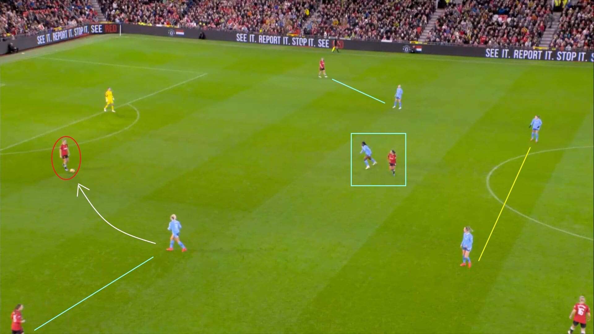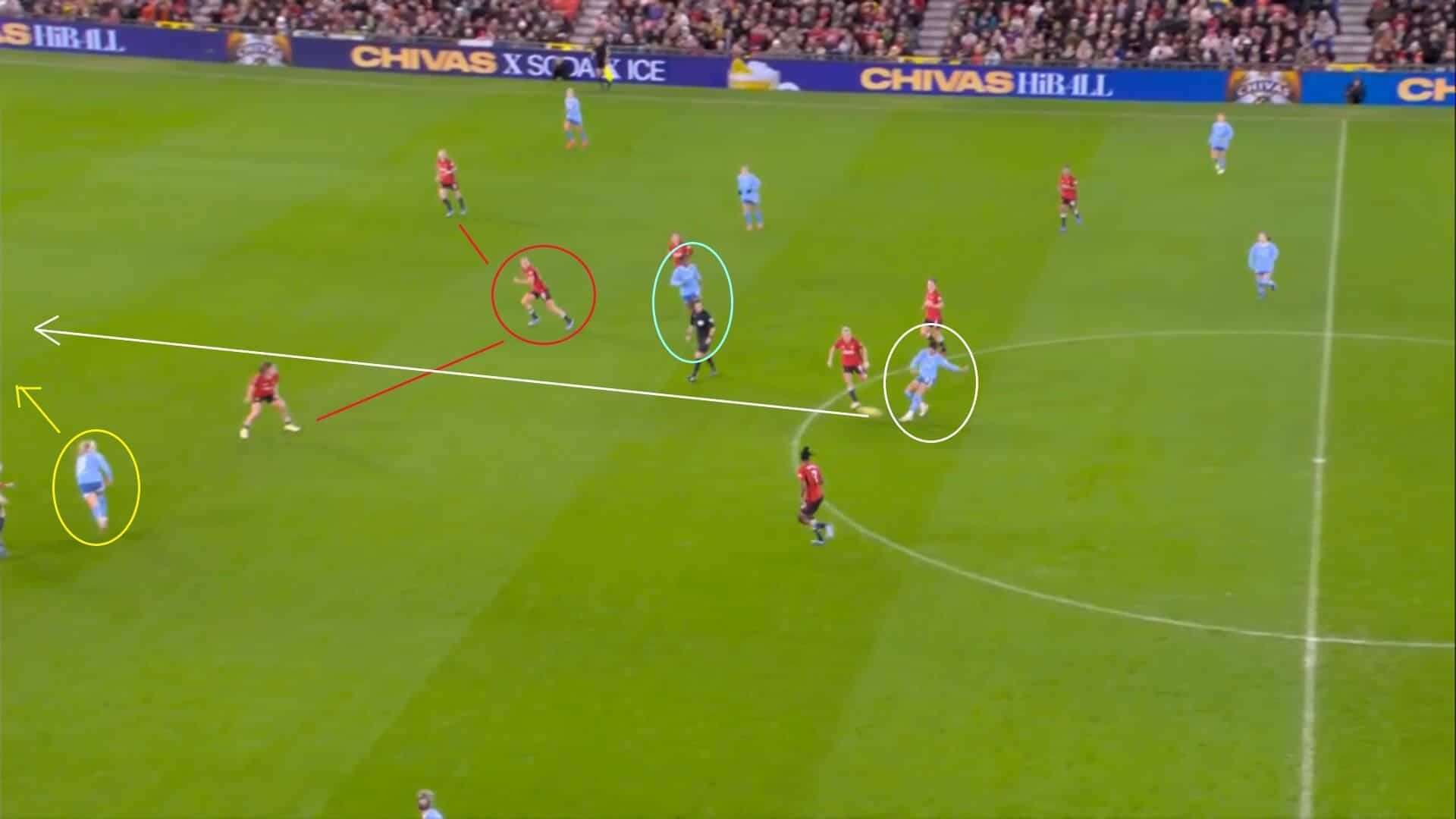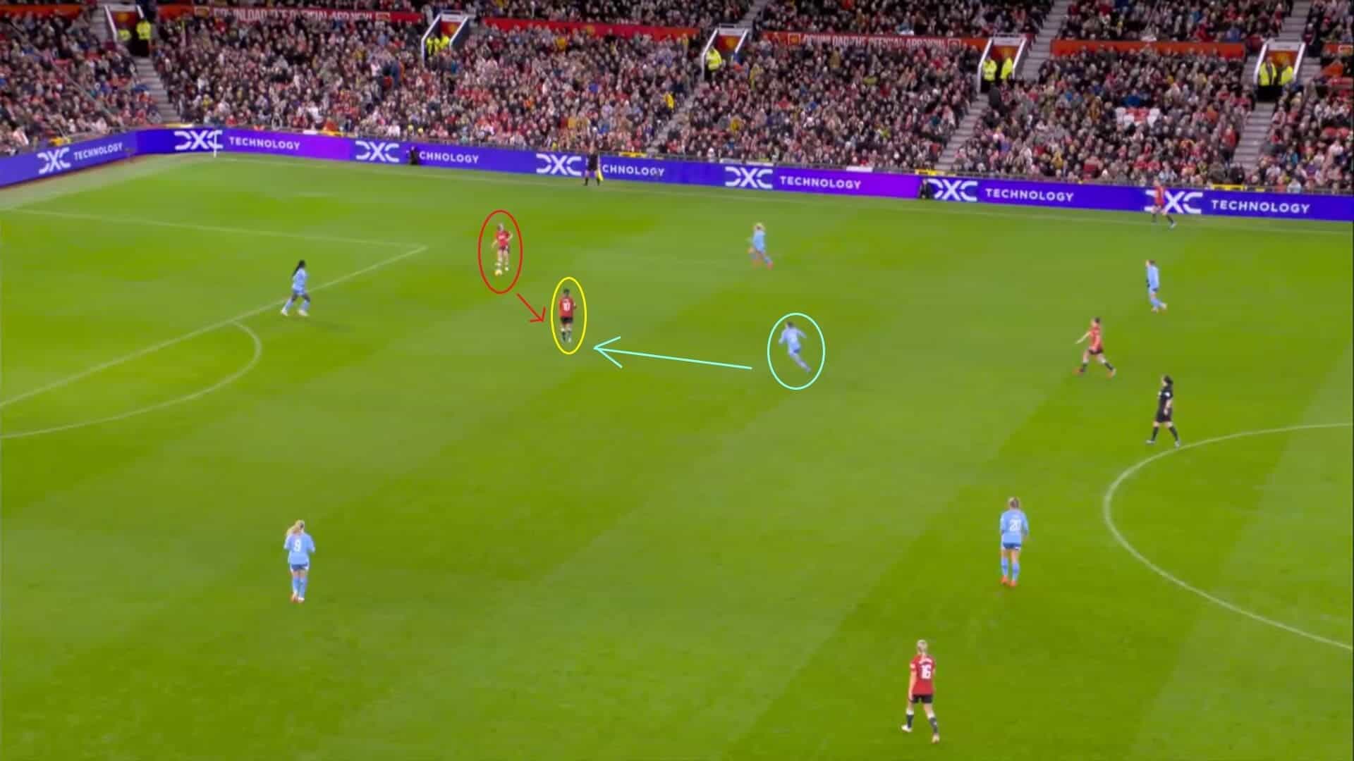 However, with Angeldahl and Roord as wide as they are here and constantly staying this far apart from each other and from Hasegawa, who has offered herself to Australia defender Alanna Kennedy as a passing option here, it was clear that Manchester City were never intending to play in that way anyway, so that aspect of Manchester United’s tactics was easily negated as a result.