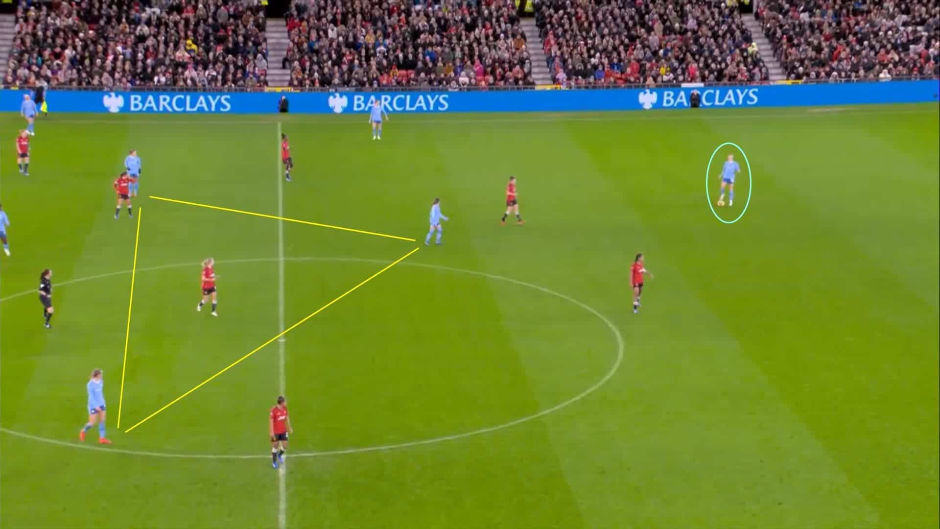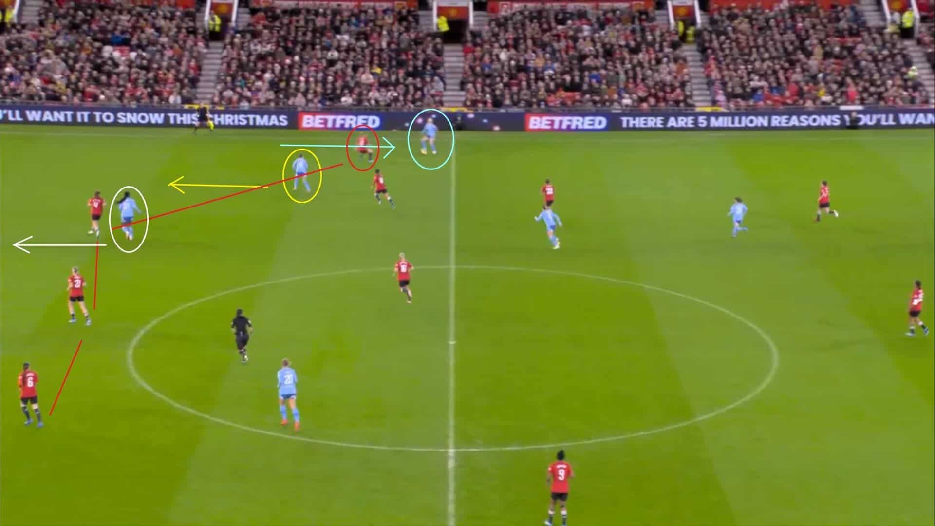 The way that they did that was not unusual, in that they set up in the same triangular shape as they do in almost every game and biasing it towards the attack, but it proved to be especially vital in this match that they played this way due to Manchester United Women setting up in a 4-2-3-1 formation and trying to limit the visitors’ ability to play too vertically whenever they had the ball.