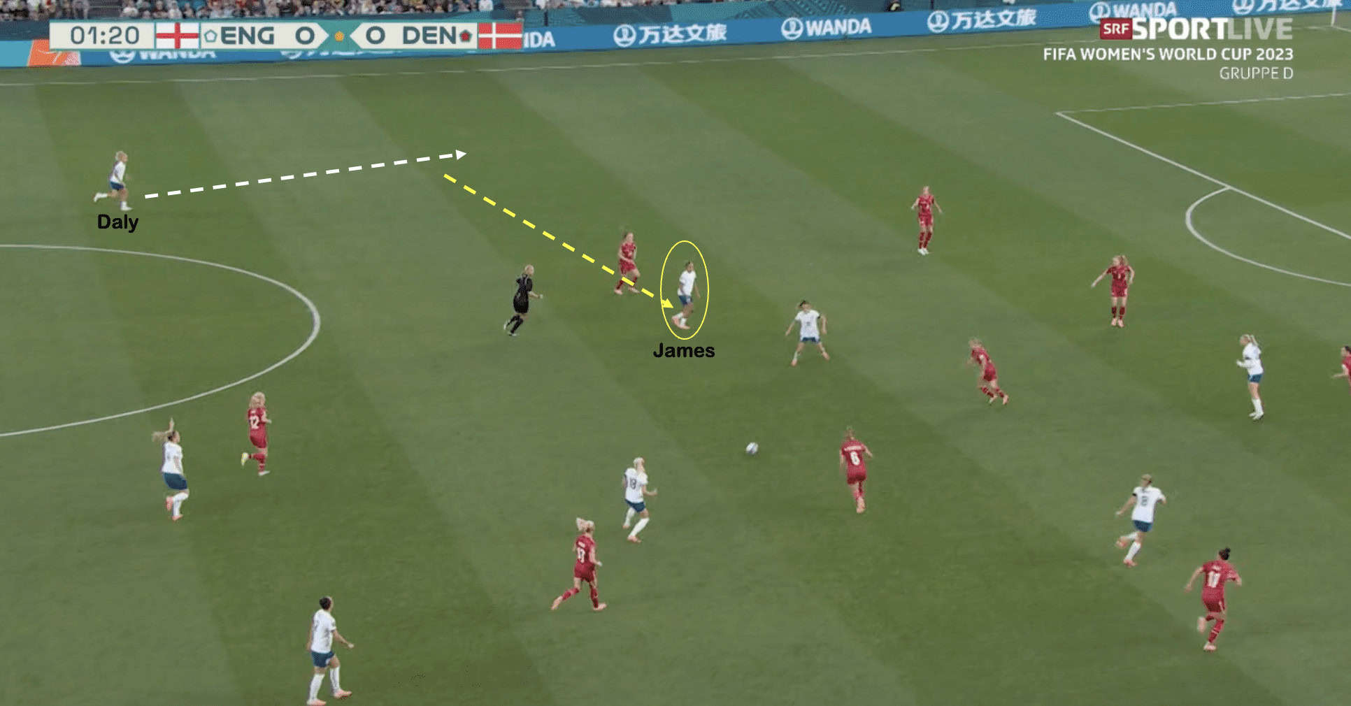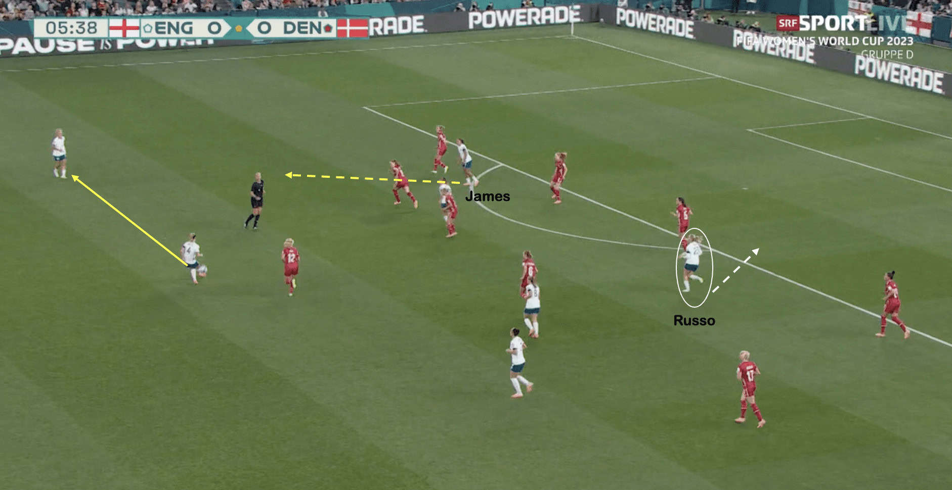 By moving centrally, James could create numerical advantages for England in the central areas of the pitch. This allowed the Lionesses to retain the ball much better and provided increased passing options. Lauren Hemp is a natural left-footer and would perhaps look to stay wider, which would keep the Danish defenders wider, whereas James’ movement infield allowed England to play short, sharp passes in tight spaces and created space down the left wing.