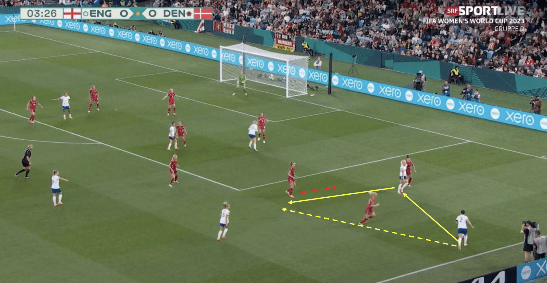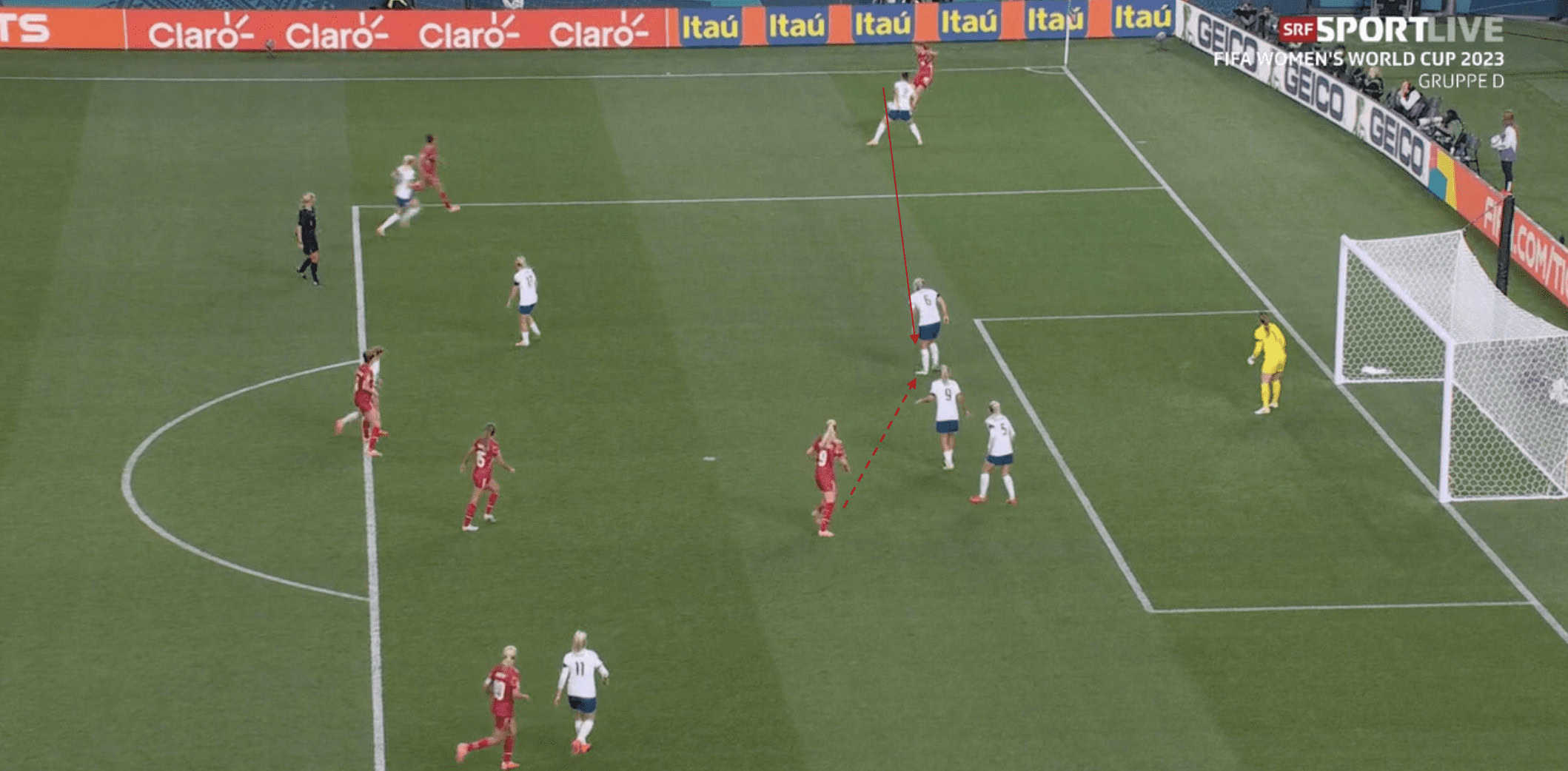 Denmark’s best opportunity came from a cross from their left (England’s right) side. As the Danes worked their way into a crossing position, Amalie Vangsgaard anticipated the cross. She made a darting run across two England defenders to execute a glancing header at goal, as shown below. Thanks to the woodwork, the score remained 1-0 to the Lionesses.