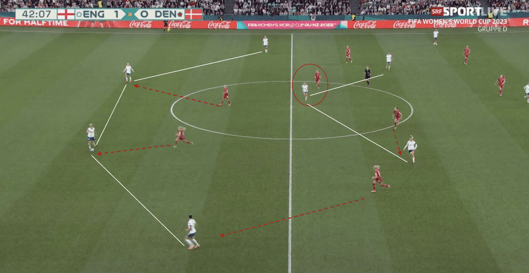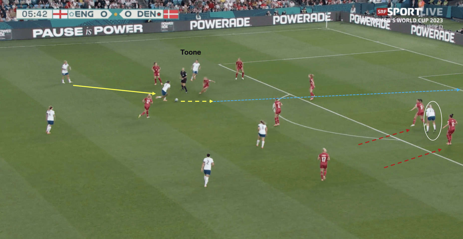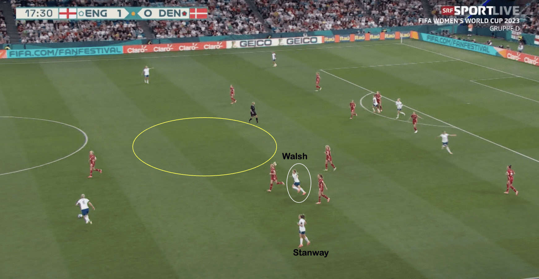 Additionally, Stanway is in a position close to Walsh which means The Danes could intercept a pass to her. This forces Millie Bright to play backwards, allowing Denmark to push higher up, ideally if Stanway were to position herself in the space highlighted. This would have made her available to receive a pass from Bright and allowed England to continue to push forward.