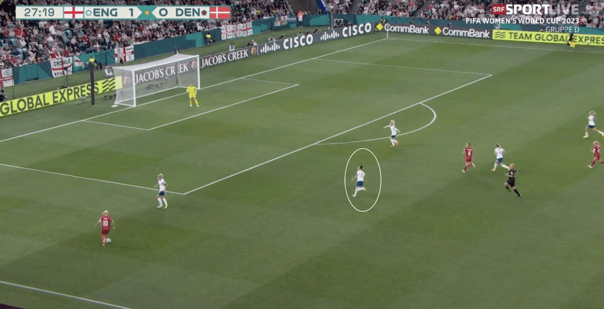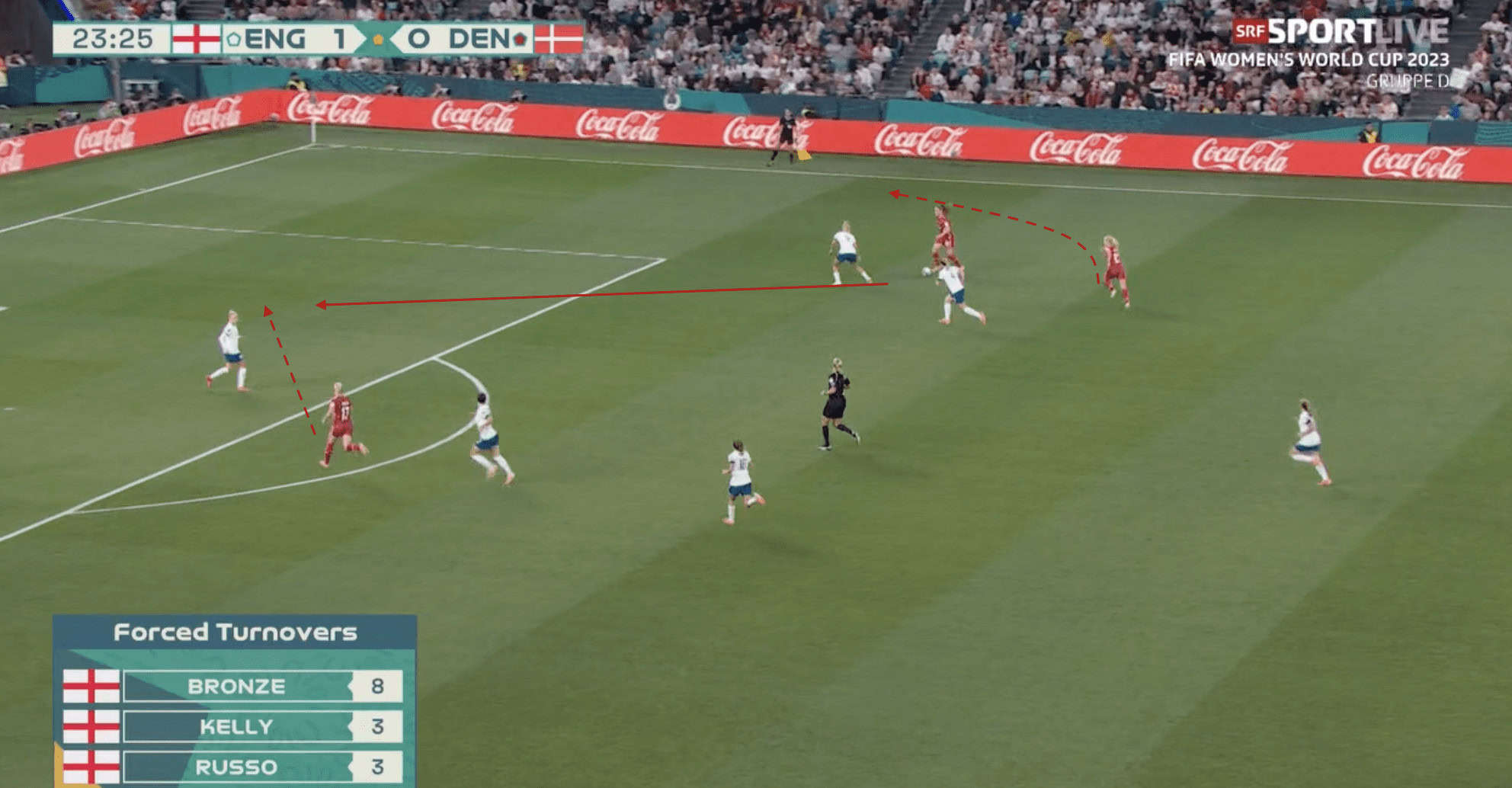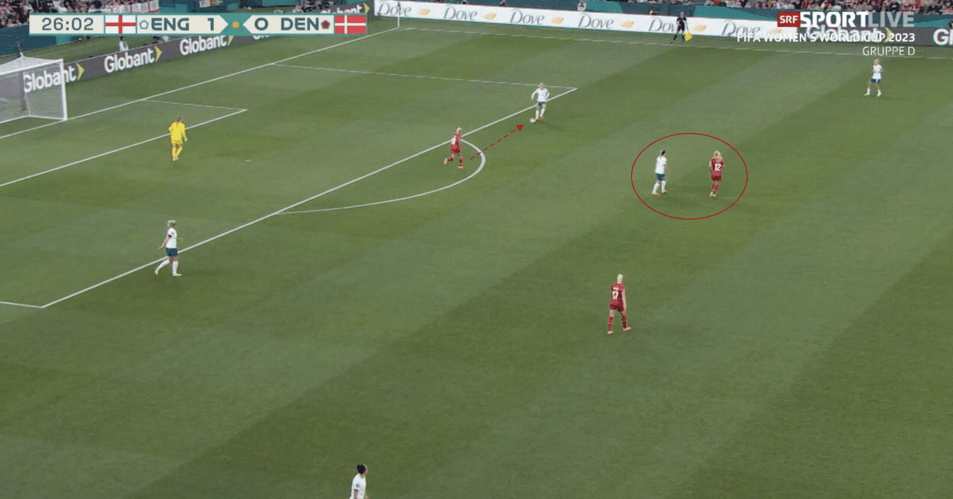Additionally, Stanway is in a position close to Walsh which means The Danes could intercept a pass to her. This forces Millie Bright to play backwards, allowing Denmark to push higher up, ideally if Stanway were to position herself in the space highlighted. This would have made her available to receive a pass from Bright and allowed England to continue to push forward.