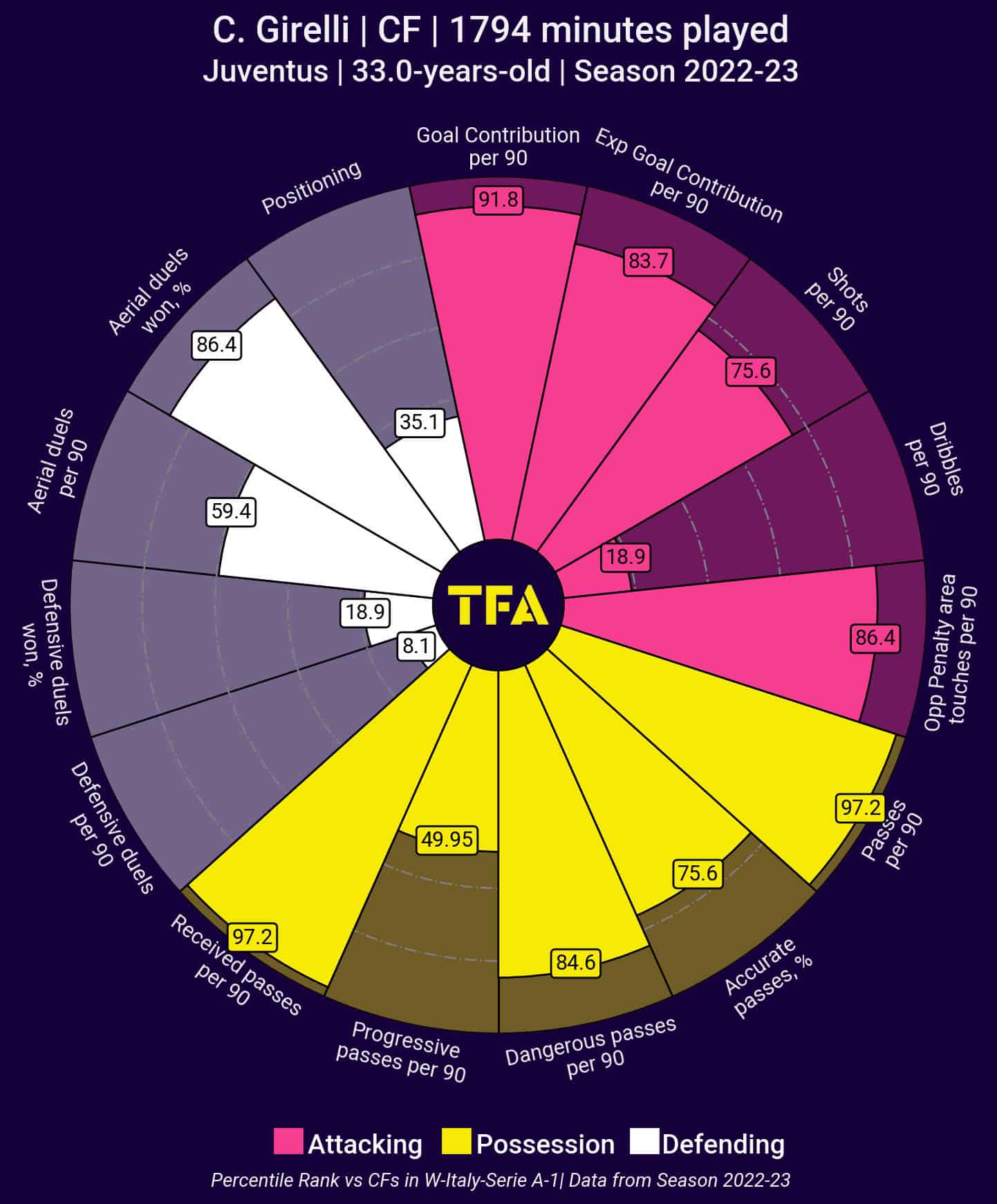 Giacinti is a player who excels in movements and in shooting on goal from different situations, with a high average per game. However, she is not good enough in aerial duels and prefers to score and contribute from open play rather than from set pieces or crosses from the wings.