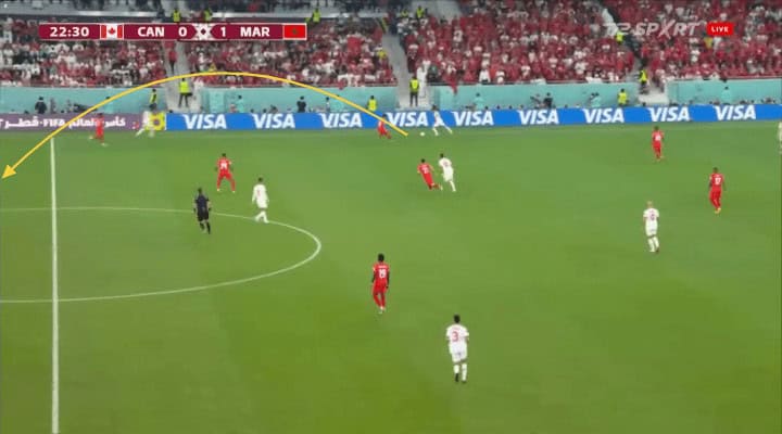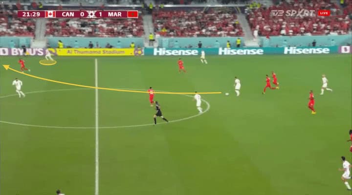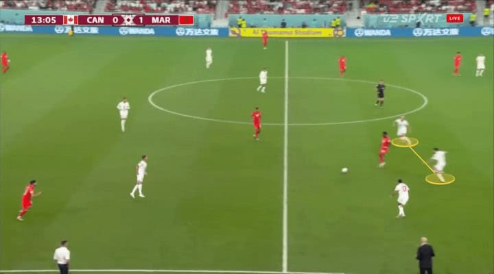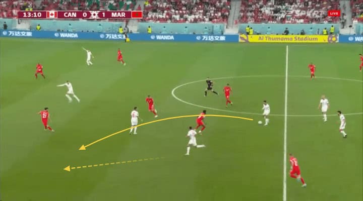 A wonderful example of this is the second goal scored against Canada. They try to move John Herdman’s team side by side, pinning players in the middle for the winger, Hakimi in this case, to throw a long pass to En-Nesyri that finished in a big way.
