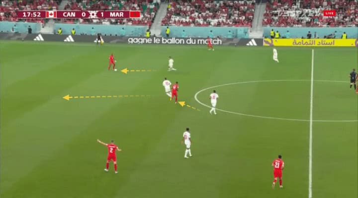 Canada found very few spaces in the match facing Morocco’s 4-1-4-1, which initially stopped like this in every organized attack by Herdman’s team, which were extremely flat and ineffective with the ball, passing it from side to side, and with few receptions between the lines.