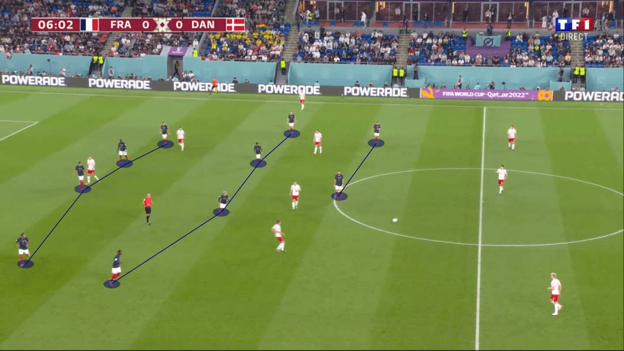 At any rate, these lower blocks will leave the Three Lions rather vulnerable. Especially as they like to commit their fullbacks forward, space will be left behind. In these situations, whom better to have than Kylian Mbappé and Ousmane Dembélé? France’s ball progression map below illustrates how often they are able to perform progressive runs to advance forward. Not only is the quantity of these runs impressive, but also how long some of them are.