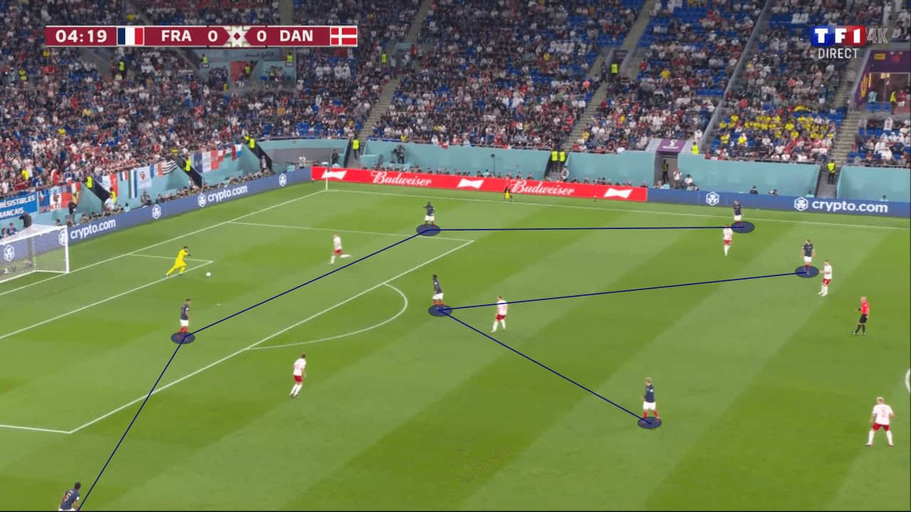 In the build-up phase, Deschamps’ men form a 4-3-3 structure, with Tchouaméni dropping as a single pivot behind Griezmann and Rabiot. The Juventus midfielder is unlikely to be the solution to England’s press, so Griezmann will be dragged in deeper if they wish to build out of the back. This will consequently take Griezmann further from goal, which would certainly be a good thing for the English.