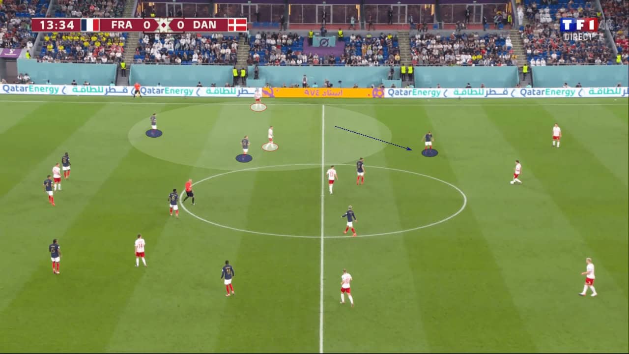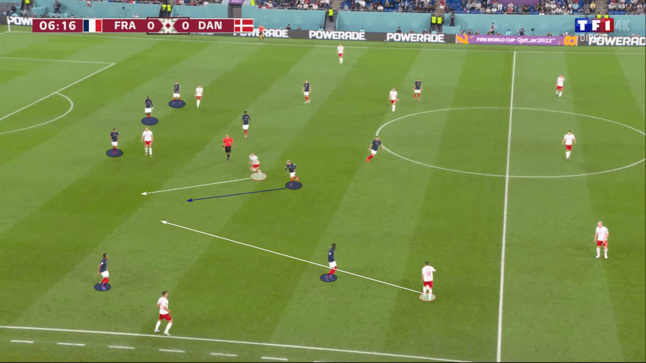 Griezmann is not very defensive, and the Atlético Madrid forward could be a weakness to exploit in the midfield. In the instance below, against Denmark, we can see how he can get caught out of position at times and become a vulnerability.