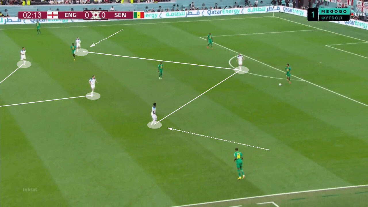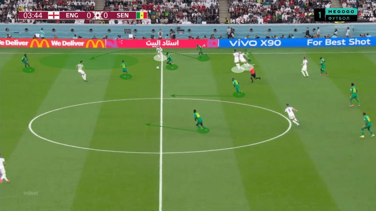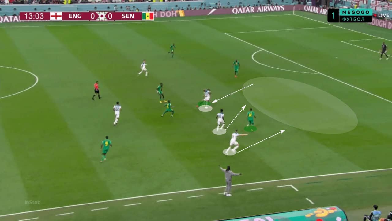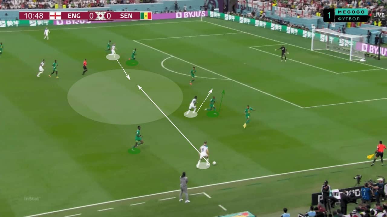 In another scenario, we are able to see England’s number nine dropping deep and dragging Senegal’s centre-back with him. This leaves space behind for Saka and Jordan Henderson to attack. If England continue with such an attacking approach, throwing numbers forward, they are likely to be successful against France’s low block.