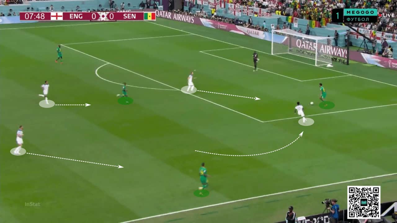 While Senegal were unable to capitalise on this, France certainly will. In the image below, after Luke Shaw bursts forward, significant space is left behind after Senegal recovers the ball. England may look to prevent this with a more cautious approach towards possession, but it may cost them going forward – as it did with Denmark.
