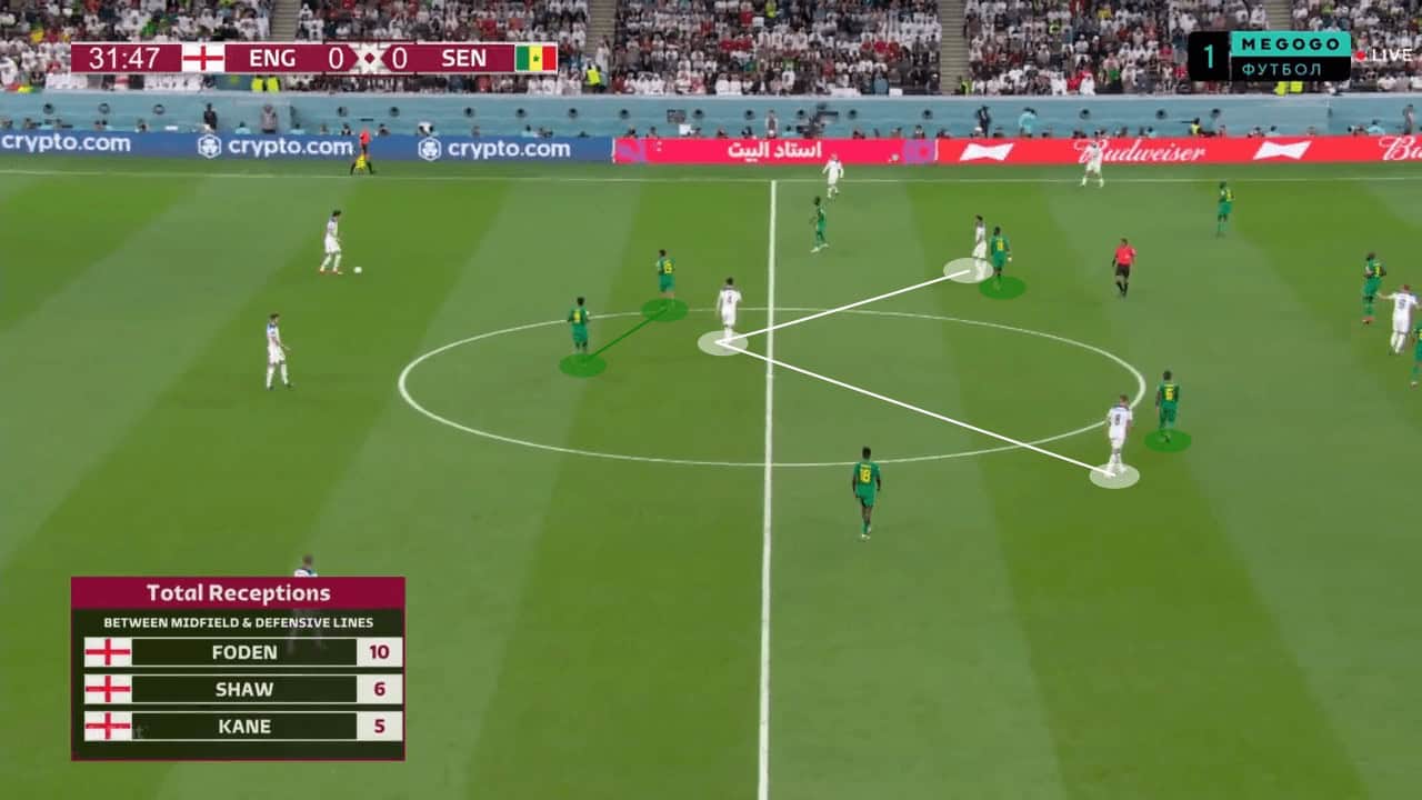 The 29-year-old is capable of supporting the wide areas, which provides an outlet and superiority. Furthermore, it also often drags the opposition’s centre-back and creates space behind. In England’s first goal against Senegal, Kane drops deep to receive a pass from Foden before playing Jude Bellingham through. Kane’s role complements Bellingham’s profile, as the Dortmund midfielder is great at bursting forward and attacking space.
