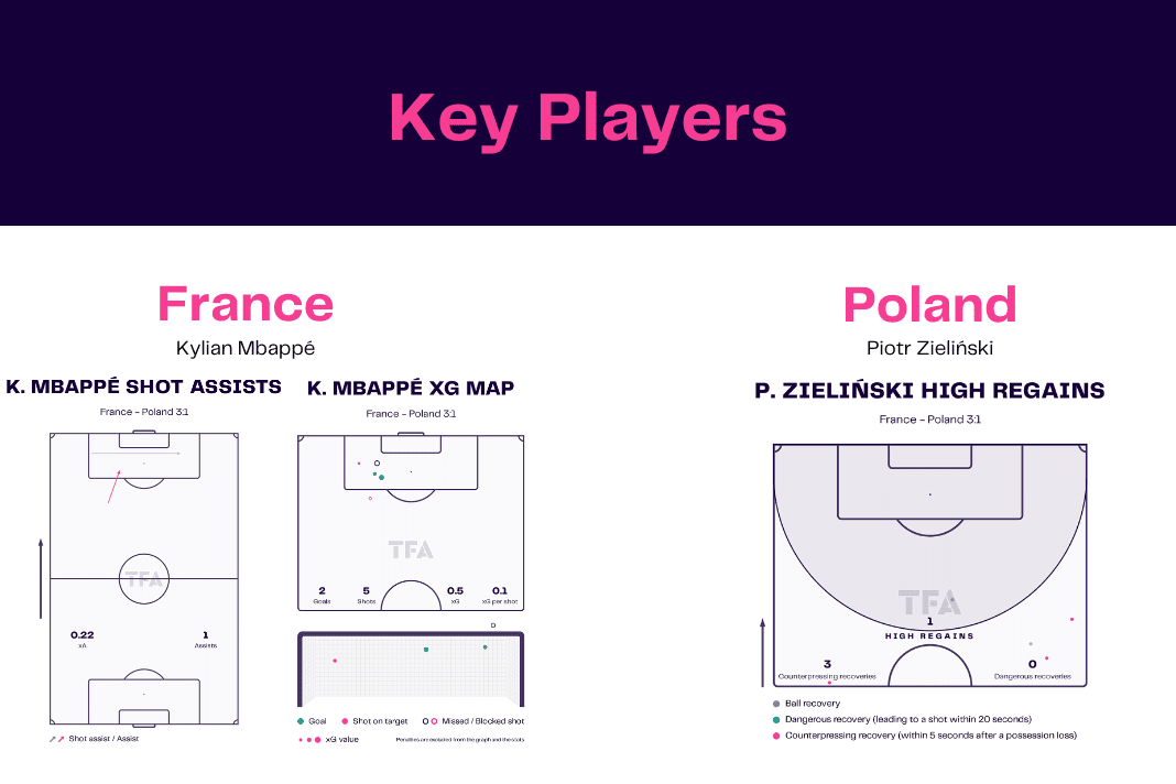 Sunday saw <a href="https://totalfootballanalysis.com/match-analysis/fifa-world-cup-2022-france-denmark-tactical-analysis-tactics">France vs Poland</a> in the <a href="https://totalfootballanalysis.com/category/competitions/fifa-world-cup-2022">FIFA World Cup 2022</a>. We've broken down all the key <a href="https://totalfootballanalysis.com/match-analysis/free-download-premier-league-gw8-analytics-reports-data-viz-and-stats">stats</a> for you to digest in this tactical analysis and provide <a href="https://totalfootballanalysis.com/player-analysis/but-what-does-that-visual-actually-tell-us">insights</a> around; * xG maps * touch maps * chance creation * penalty area entries * ball progression * high regains * fouls & errors * and much more! We also try to answer some questions for you with the visuals; Who was <a href="https://totalfootballanalysis.com/match-analysis/fifa-world-cup-2022-france-vs-australia-tactical-analysis-tactics">France's</a> biggest threat? Who made the most recoveries in the opposition half? Who had the highest xG in the match? To navigate the stats gallery simply click on the numbers to move through the pages. <a href="https://totalfootballanalysis.com/wp-content/uploads/2022/12/2-15.jpg"><img class="aligncenter size-large wp-image-359628" src="https://totalfootballanalysis.com/wp-content/uploads/2022/12/2-15-1024x683.jpg" alt="FIFA World Cup 2022: France vs Poland - data viz, stats and insights" width="640" height="427" /></a> <a href="https://totalfootballanalysis.com/wp-content/uploads/2022/12/3-15.jpg"><img class="aligncenter size-large wp-image-359629" src="https://totalfootballanalysis.com/wp-content/uploads/2022/12/3-15-1024x683.jpg" alt="FIFA World Cup 2022: France vs Poland - data viz, stats and insights" width="640" height="427" /></a> <a href="https://totalfootballanalysis.com/wp-content/uploads/2022/12/4-15.png"><img class="aligncenter size-large wp-image-359630" src="https://totalfootballanalysis.com/wp-content/uploads/2022/12/4-15-1024x683.png" alt="FIFA World Cup 2022: France vs Poland - data viz, stats and insights" width="640" height="427" /></a> <a href="https://totalfootballanalysis.com/wp-content/uploads/2022/12/5-15.png"><img class="aligncenter size-large wp-image-359631" src="https://totalfootballanalysis.com/wp-content/uploads/2022/12/5-15-1024x683.png" alt="FIFA World Cup 2022: France vs Poland - data viz, stats and insights" width="640" height="427" /></a> <a href="https://totalfootballanalysis.com/wp-content/uploads/2022/12/6-15.png"><img class="aligncenter size-large wp-image-359632" src="https://totalfootballanalysis.com/wp-content/uploads/2022/12/6-15-1024x683.png" alt="FIFA World Cup 2022: France vs Poland - data viz, stats and insights" width="640" height="427" /></a> <a href="https://totalfootballanalysis.com/wp-content/uploads/2022/12/7-15.png"><img class="aligncenter size-large wp-image-359633" src="https://totalfootballanalysis.com/wp-content/uploads/2022/12/7-15-1024x683.png" alt="FIFA World Cup 2022: France vs Poland - data viz, stats and insights" width="640" height="427" /></a> <strong>Turn the page for the xG map, chances created and more</strong><!--nextpage--> <a href="https://totalfootballanalysis.com/wp-content/uploads/2022/12/8-15.png"><img class="aligncenter size-large wp-image-359634" src="https://totalfootballanalysis.com/wp-content/uploads/2022/12/8-15-1024x683.png" alt="FIFA World Cup 2022: France vs Poland - data viz, stats and insights" width="640" height="427" /></a> <a href="https://totalfootballanalysis.com/wp-content/uploads/2022/12/9-15.png"><img class="aligncenter size-large wp-image-359635" src="https://totalfootballanalysis.com/wp-content/uploads/2022/12/9-15-1024x683.png" alt="FIFA World Cup 2022: France vs Poland - data viz, stats and insights" width="640" height="427" /></a> <strong>Turn the page for the pass zones, maps, stats and more</strong><!--nextpage--> <a href="https://totalfootballanalysis.com/wp-content/uploads/2022/12/10-15.png"><img class="aligncenter size-large wp-image-359636" src="https://totalfootballanalysis.com/wp-content/uploads/2022/12/10-15-1024x683.png" alt="FIFA World Cup 2022: France vs Poland - data viz, stats and insights" width="640" height="427" /></a> <a href="https://totalfootballanalysis.com/wp-content/uploads/2022/12/11-15.jpg"><img class="aligncenter size-large wp-image-359637" src="https://totalfootballanalysis.com/wp-content/uploads/2022/12/11-15-1024x683.jpg" alt="FIFA World Cup 2022: France vs Poland - data viz, stats and insights" width="640" height="427" /></a> <a href="https://totalfootballanalysis.com/wp-content/uploads/2022/12/12-15.png"><img class="aligncenter size-large wp-image-359638" src="https://totalfootballanalysis.com/wp-content/uploads/2022/12/12-15-1024x683.png" alt="FIFA World Cup 2022: France vs Poland - data viz, stats and insights" width="640" height="427" /></a> <a href="https://totalfootballanalysis.com/wp-content/uploads/2022/12/13-15.png"><img class="aligncenter size-large wp-image-359639" src="https://totalfootballanalysis.com/wp-content/uploads/2022/12/13-15-1024x683.png" alt="FIFA World Cup 2022: France vs Poland - data viz, stats and insights" width="640" height="427" /></a> <a href="https://totalfootballanalysis.com/wp-content/uploads/2022/12/14-15.png"><img class="aligncenter size-large wp-image-359640" src="https://totalfootballanalysis.com/wp-content/uploads/2022/12/14-15-1024x683.png" alt="FIFA World Cup 2022: France vs Poland - data viz, stats and insights" width="640" height="427" /></a> <a href="https://totalfootballanalysis.com/wp-content/uploads/2022/12/15-15.png"><img class="aligncenter size-large wp-image-359641" src="https://totalfootballanalysis.com/wp-content/uploads/2022/12/15-15-1024x683.png" alt="FIFA World Cup 2022: France vs Poland - data viz, stats and insights" width="640" height="427" /></a> <a href="https://totalfootballanalysis.com/wp-content/uploads/2022/12/16-15.png"><img class="aligncenter size-large wp-image-35