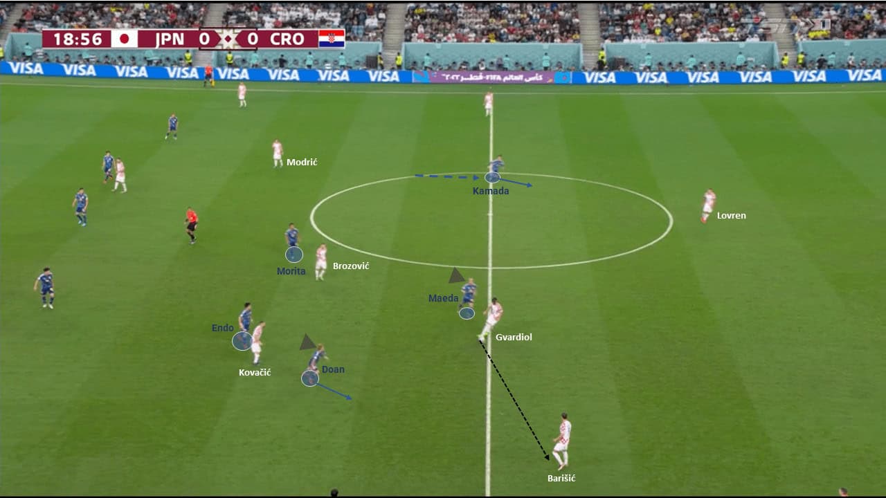 In the higher Figure. In this case, Joško Gvardiol has the ball and hasn’t any option to penetrate because of Japan’s good shape. Daizen Maeda had jumped to press him whilst closing the central pass to Marcelo Brozović who was pressed by Hidemasa Morita. Consequently, Ritsu Doan jumped to press him with closing the passing lane to Mateo Kovačić. Daichi Kamada jumped to Dejan Lovren.