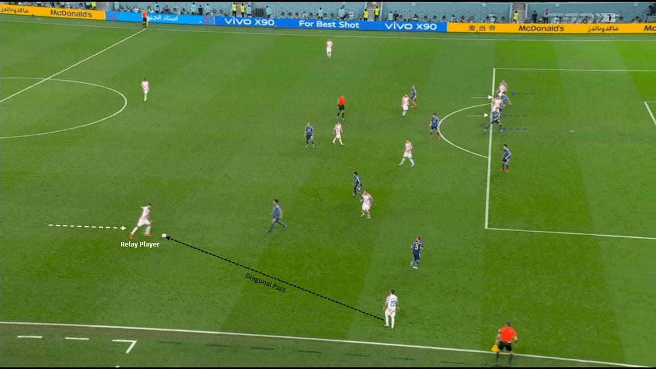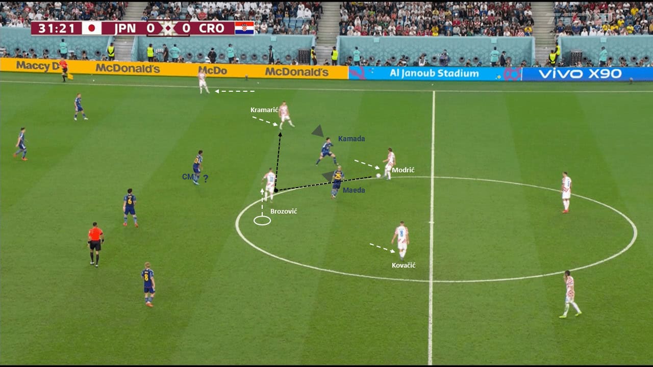 Also, Croatia, due to having a gift like their midfielders, tried to apply pass schemes or combinations to bypass the mid-block. Marcelo Brozović constantly made clever movements to escape from Daizen Maeda’s shadow and create space for his teammates also to use his abilities (passing and press resistance) to break through the lines with a clever third-man combination or 1-2 s. Plus perhaps Luka Modrić and Mateo Kovačić’s drop off to make confusion then created an extra option or progress with the ball forward.