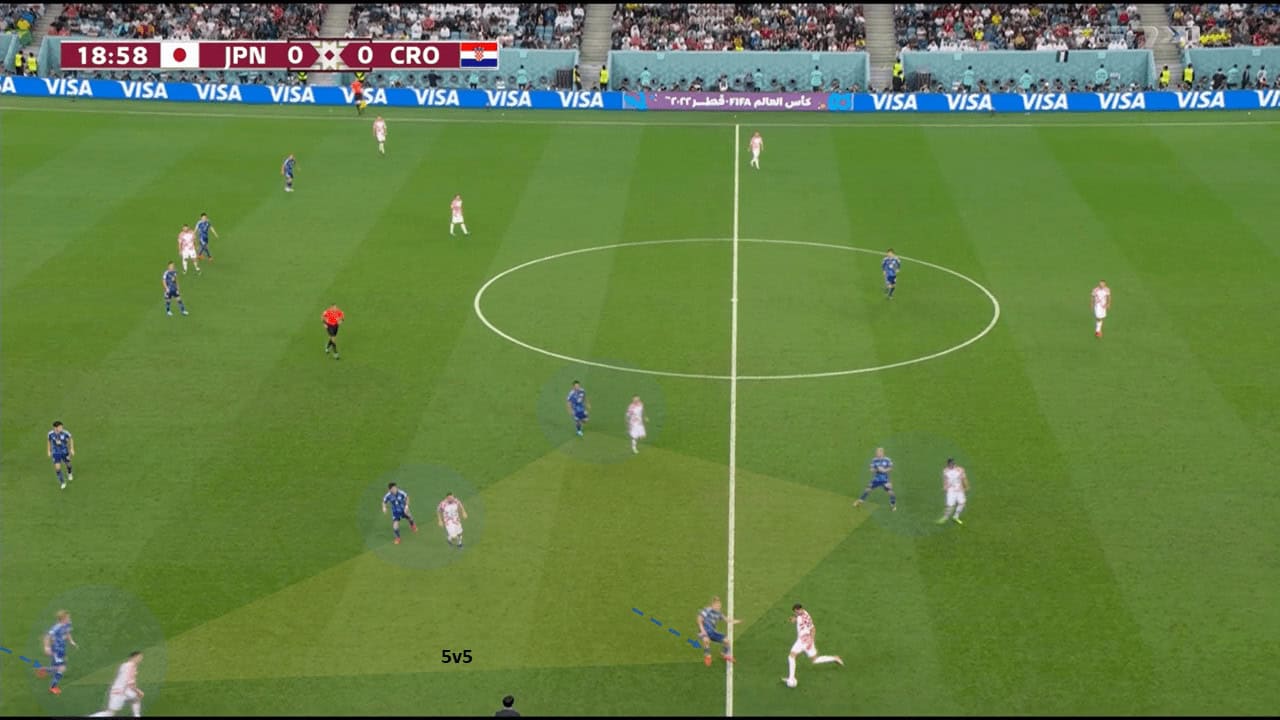 It was a trap! A trap that was very frequent and Japan used to apply it in the group stage brilliantly and caused much of their danger. Here in the below figure, After the ball came to Borna Barišić, Samurai players applied tight man-to-man pressure to get the ball back immediately in a scenario of numerical parity 5v5 inside a small space using the touch-line as an extra defender.