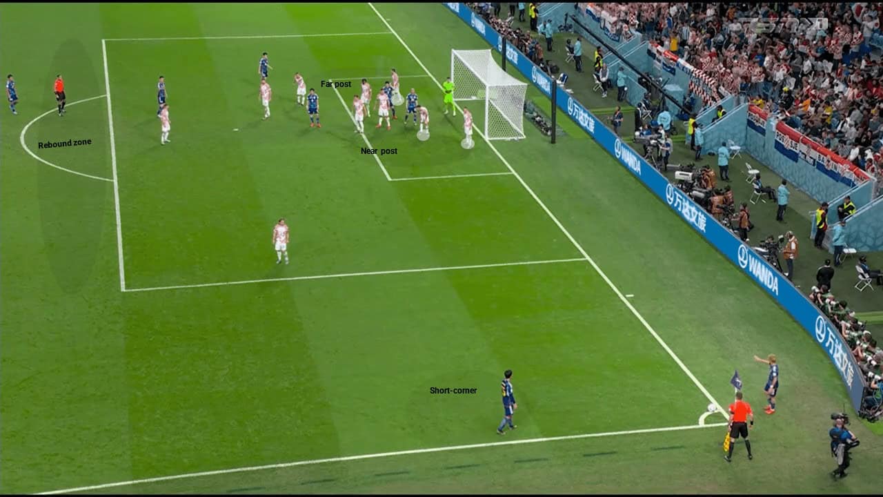 Foremost, Japan’s distribution. There had two players central in six yards, followed by three players, One of them in the far post and two central inside the box. Furthermore, Japan had a one player moved out for a possible short-corner (variation), one player occupied the rebound zone (edge of the box) ready for the second ball, and two players stayed at the back to prevent any possible transitions (preventive cover). Croatia decided to defend zonal marking and Luka Modrić was near to the ball ready for the short-corner (Possibly dangerous 2v1).