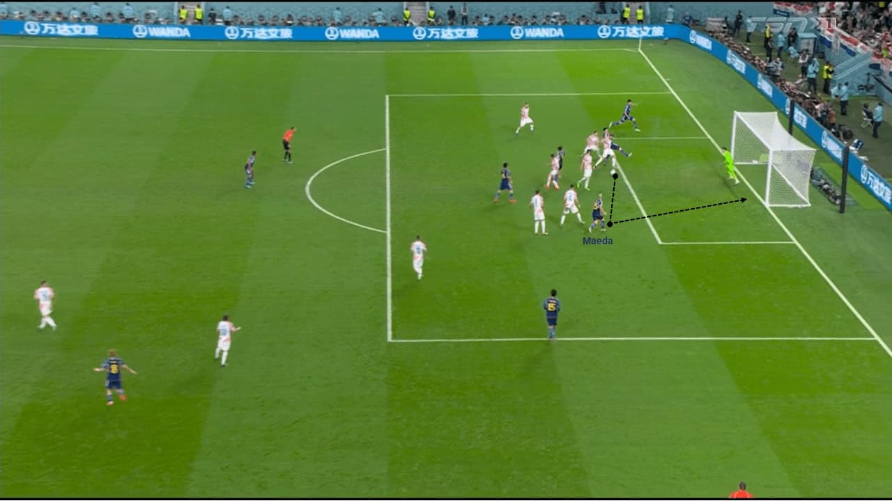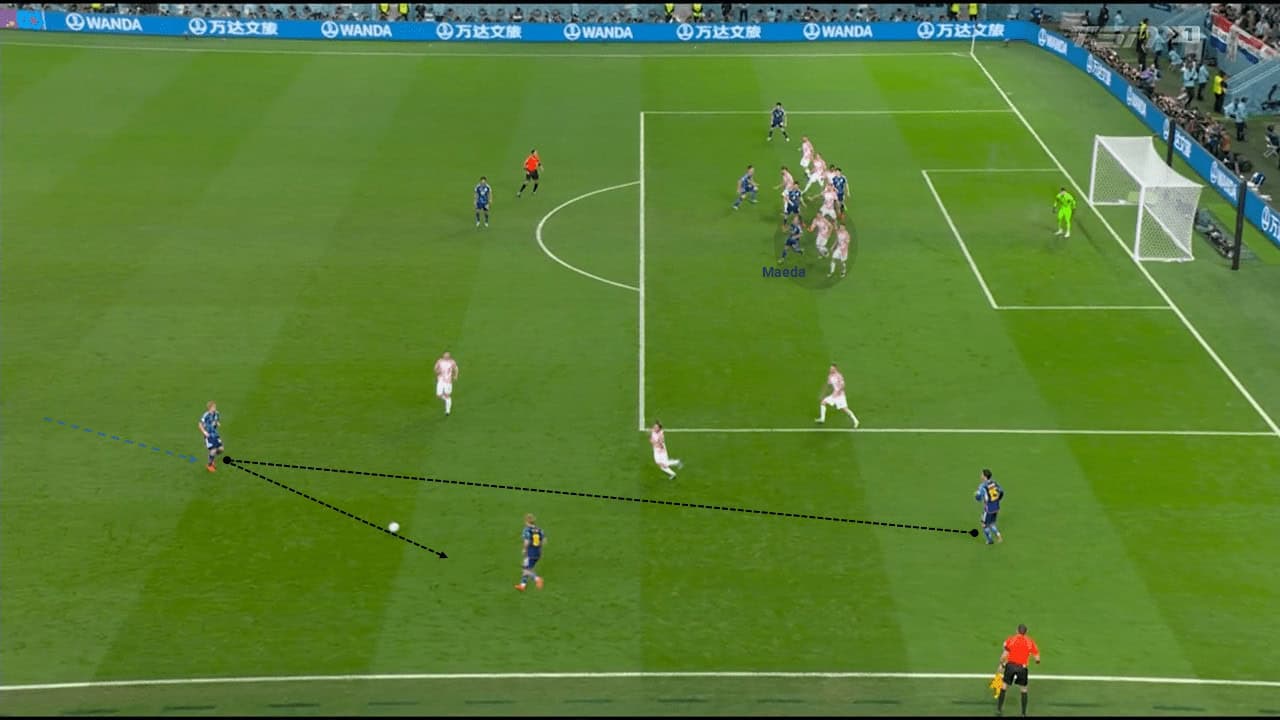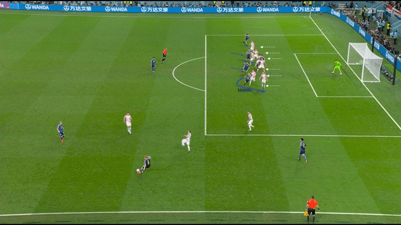 Inside the box, As a result of this back pass ‘trigger’, Croatia’s defensive block had been provoked to move up and open spaces either behind or in between the lines. Meanwhile, Japanese players distributed equally and covered all possible areas/zones. Daizen Maeda seemed to run across the front of Croatia’s two players.