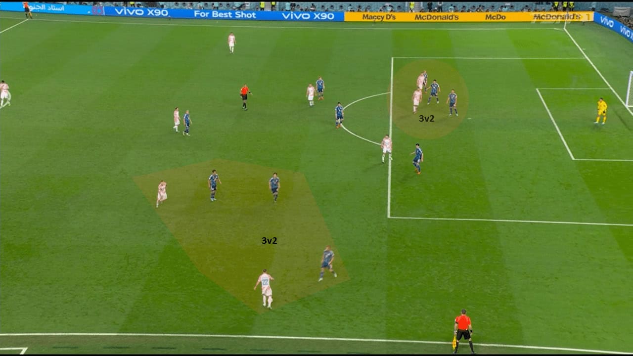 In this case, Croatia was underloaded inside and outside the box. Croatia’s player with the ball was stuck in 3v2 for Japan, and there was a need to exit from this situation.