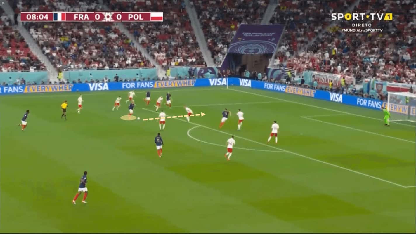 The simple act of occupying these areas between the lines, and then moving or vice versa, is already enough for Mbappé to break the block of any team, but in this case the Poland one. One of the central defenders jumped aggressively to put pressure on him, or the full-back, Cash couldn’t decide whether to go for Théo or for him and in these actions, spaces were generated for each one of them, Théo or Mbappé, to receive and run.