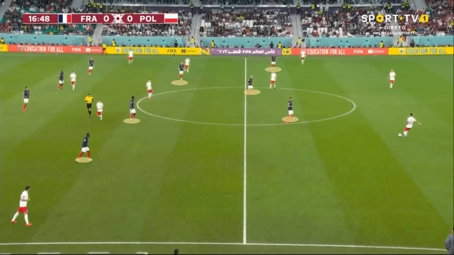 Thus, Aurélien Tchouméni took a rather interesting role in possession, looking to stretch the opponent, moving outward taking the outside lane, so that Kylian Mbappé would stay in the half-space, but this would make Poland move their lines there and separate more their lines, which was going to make them progress to the French who were looking to change to the weak-side of the ball if this was done, or inside with some reception from Mbappé. In addition, this made Adrien Rabiot take another height, attracting the full-back and consequently freeing Théo on the outside.