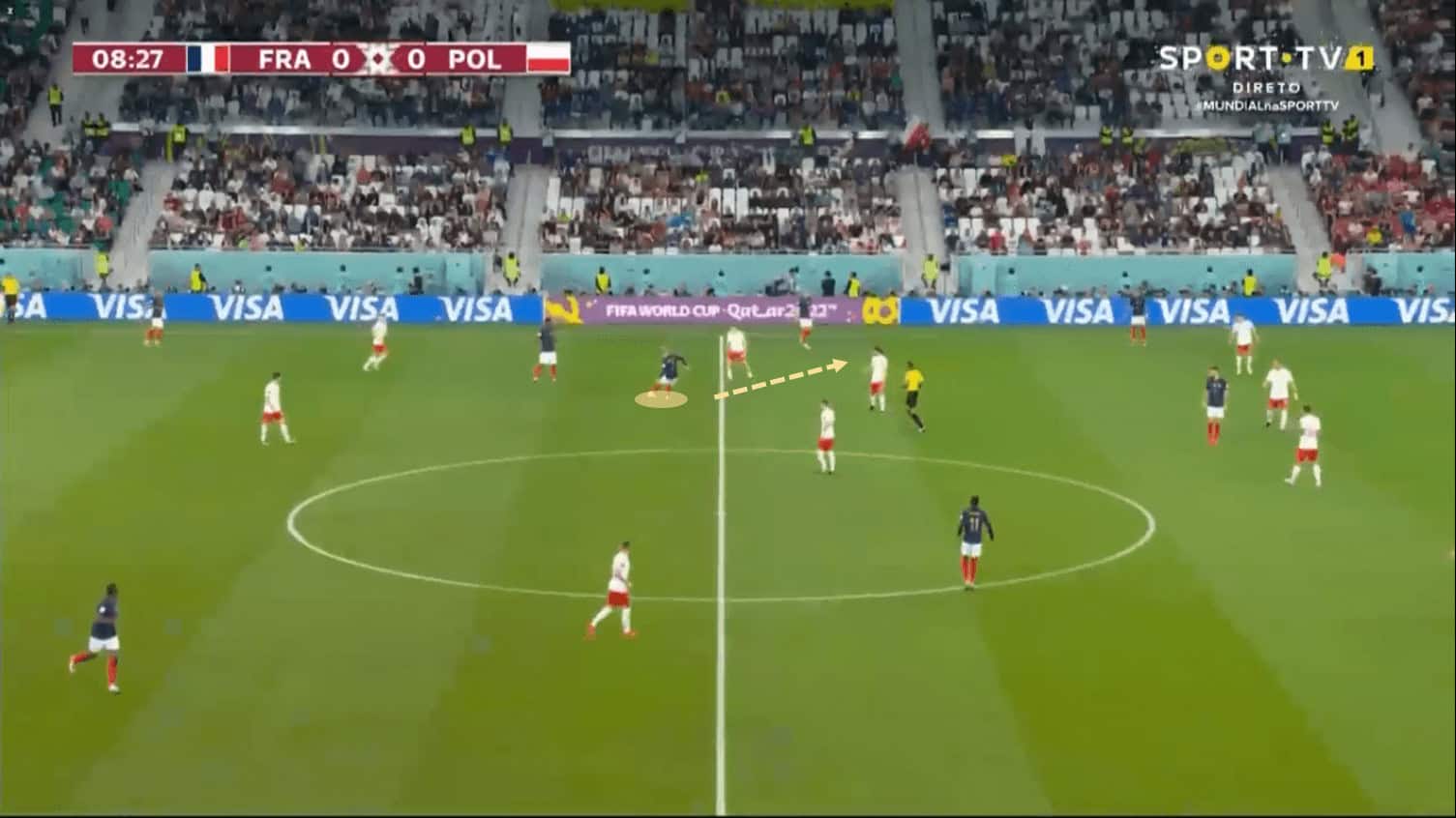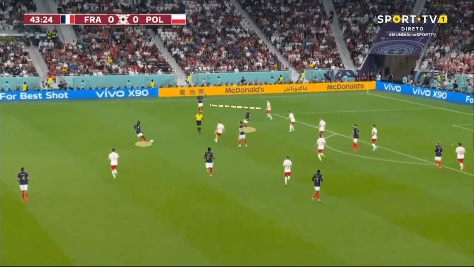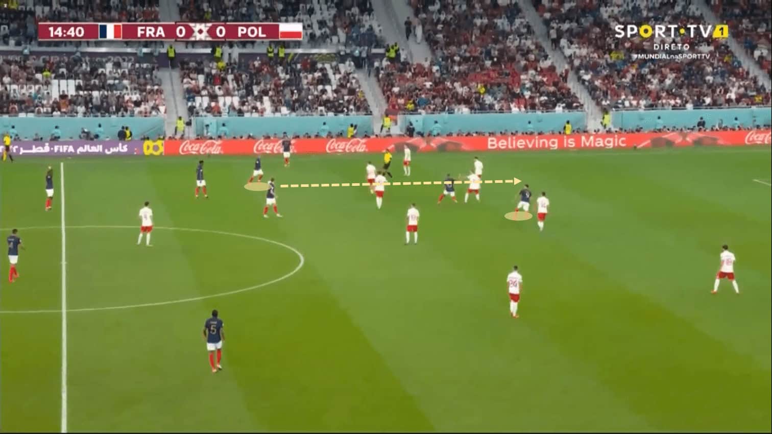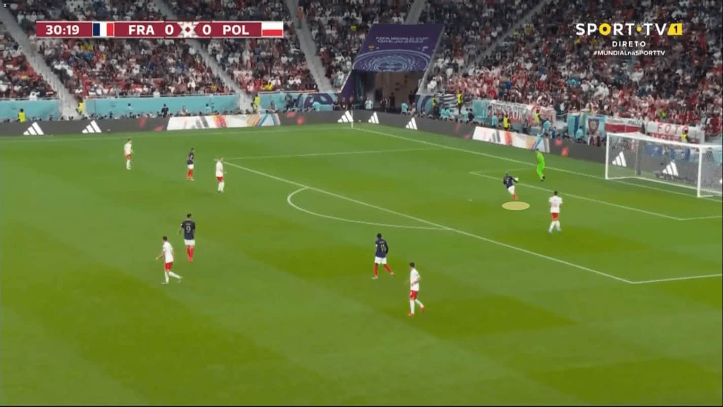 It was important in order to look for Kylian who, in this example, is receiving, as many times in the match, a ball played that was previously completely changed the side, also as a first-time type of pass, by Griezmann. These are the first signs of what was expected from France in most of his progressions, Mbappé was very wide on his left wing, looking to dribble outside and show his explosiveness with his speed that is unstoppable for any defender in the world.