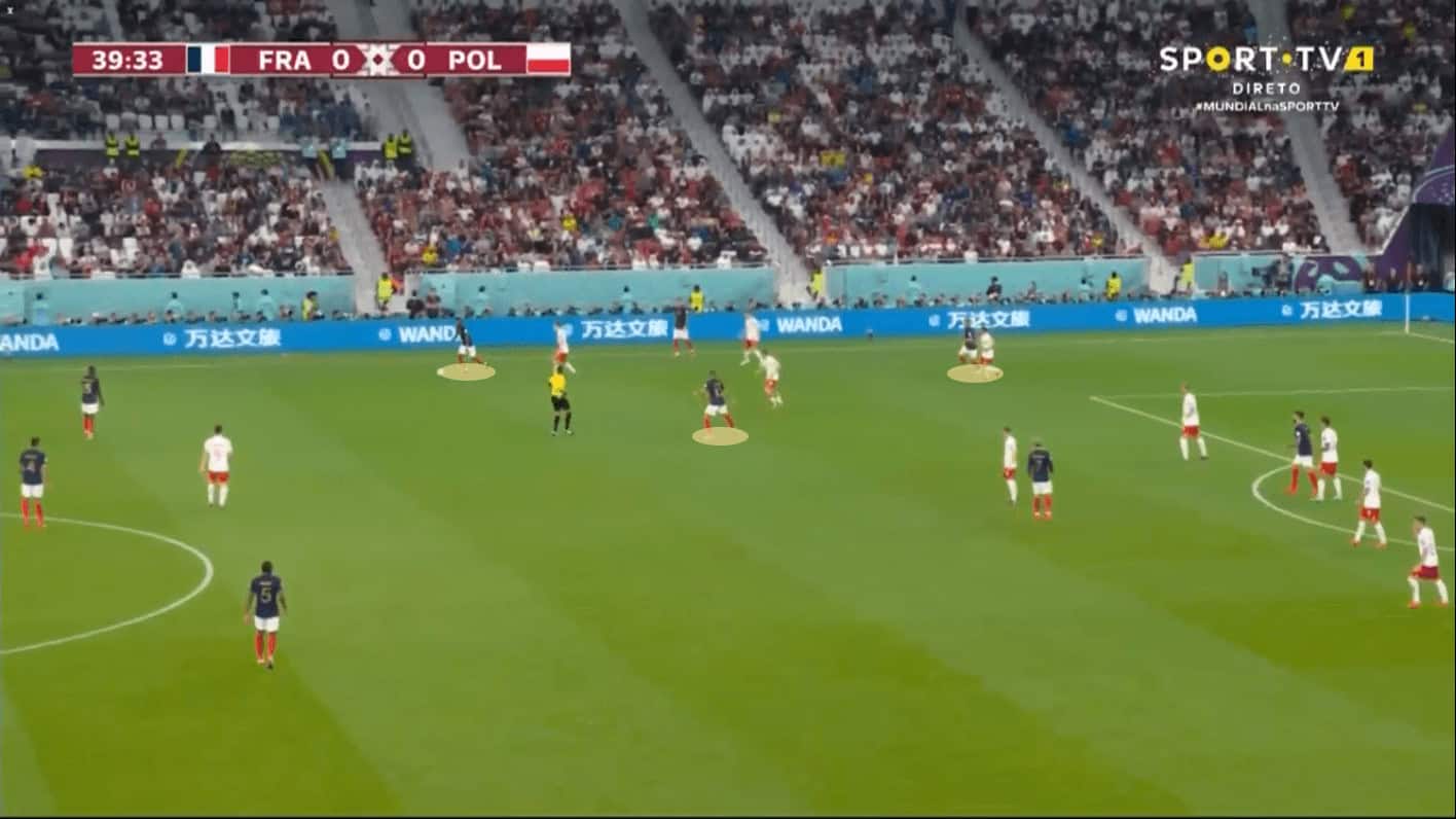 The intensity of France to aggressively mark and defend the balls that the Polish side were trying to progress through the lines, was extremely at another mental and physical pace in which Poland wanted to play the game and it was exhausting and stressing them not to see the ball for more two or three passes in a row.