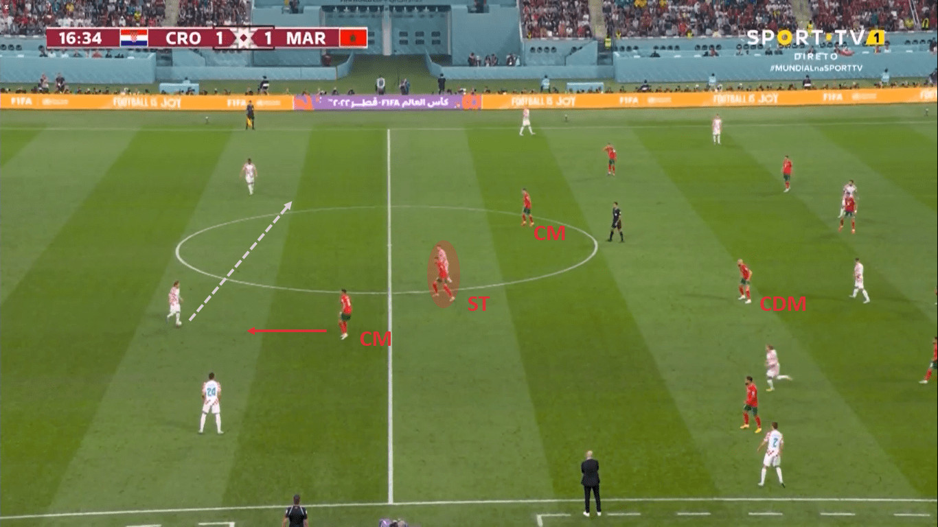 FIFA World Cup 2022: Croatia – Morocco - tactical analysis In the next picture, you can see the follow-up scene to the previous one. The Moroccan striker tries to mark the opposing central midfielder. The left central midfielder, who has just started to run, drops back into the midfield line.