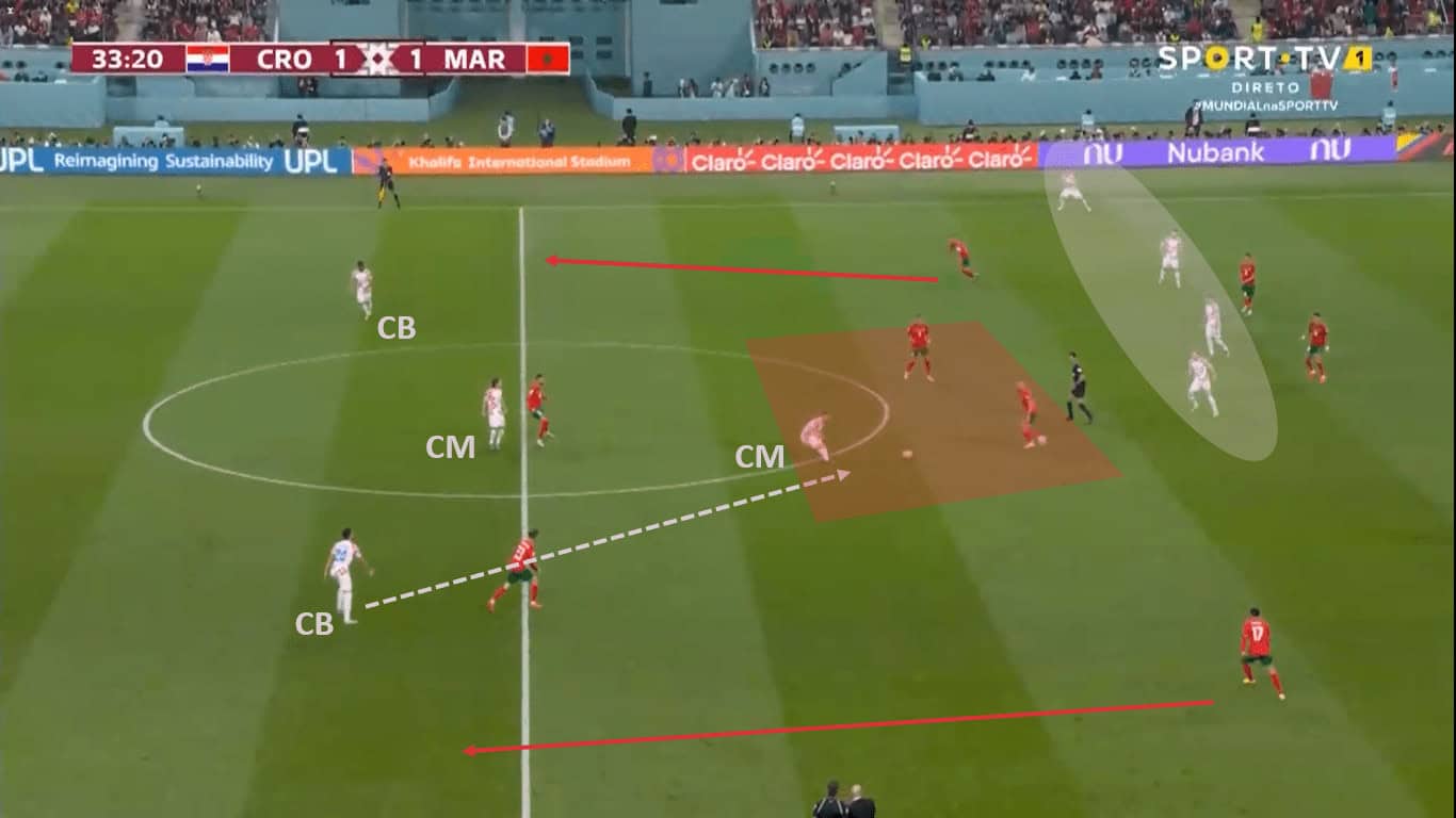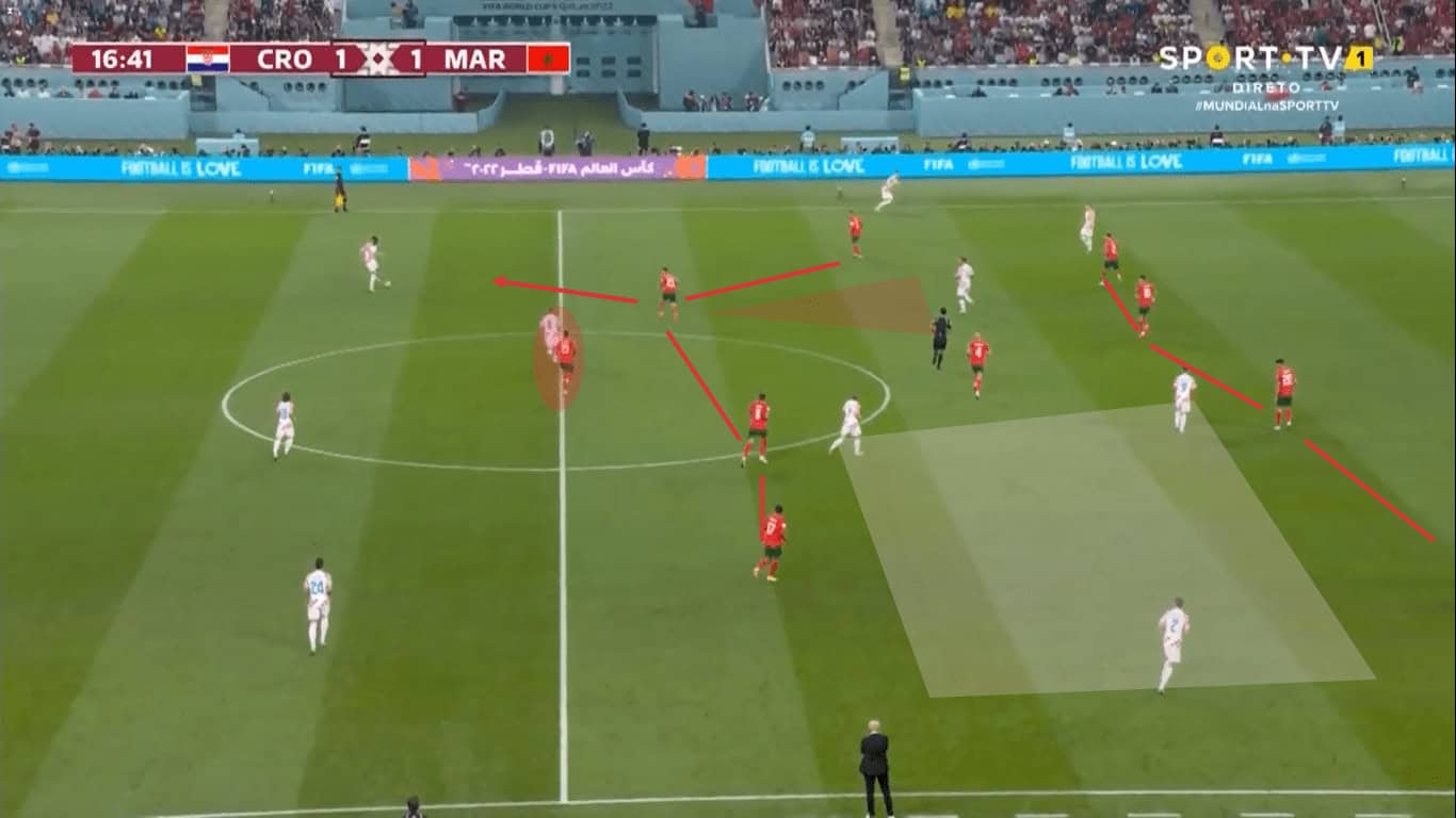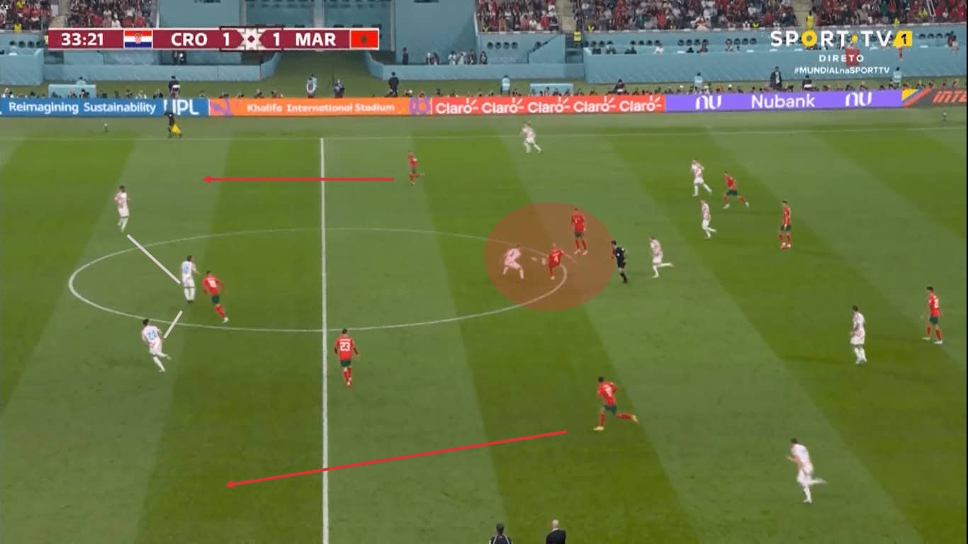 FIFA World Cup 2022: Croatia – Morocco - tactical analysis In the next picture you can see Morocco trying to switch as a result of the first scene. Here you can see, as already mentioned, that both outside midfielders start shortly after winning the ball.