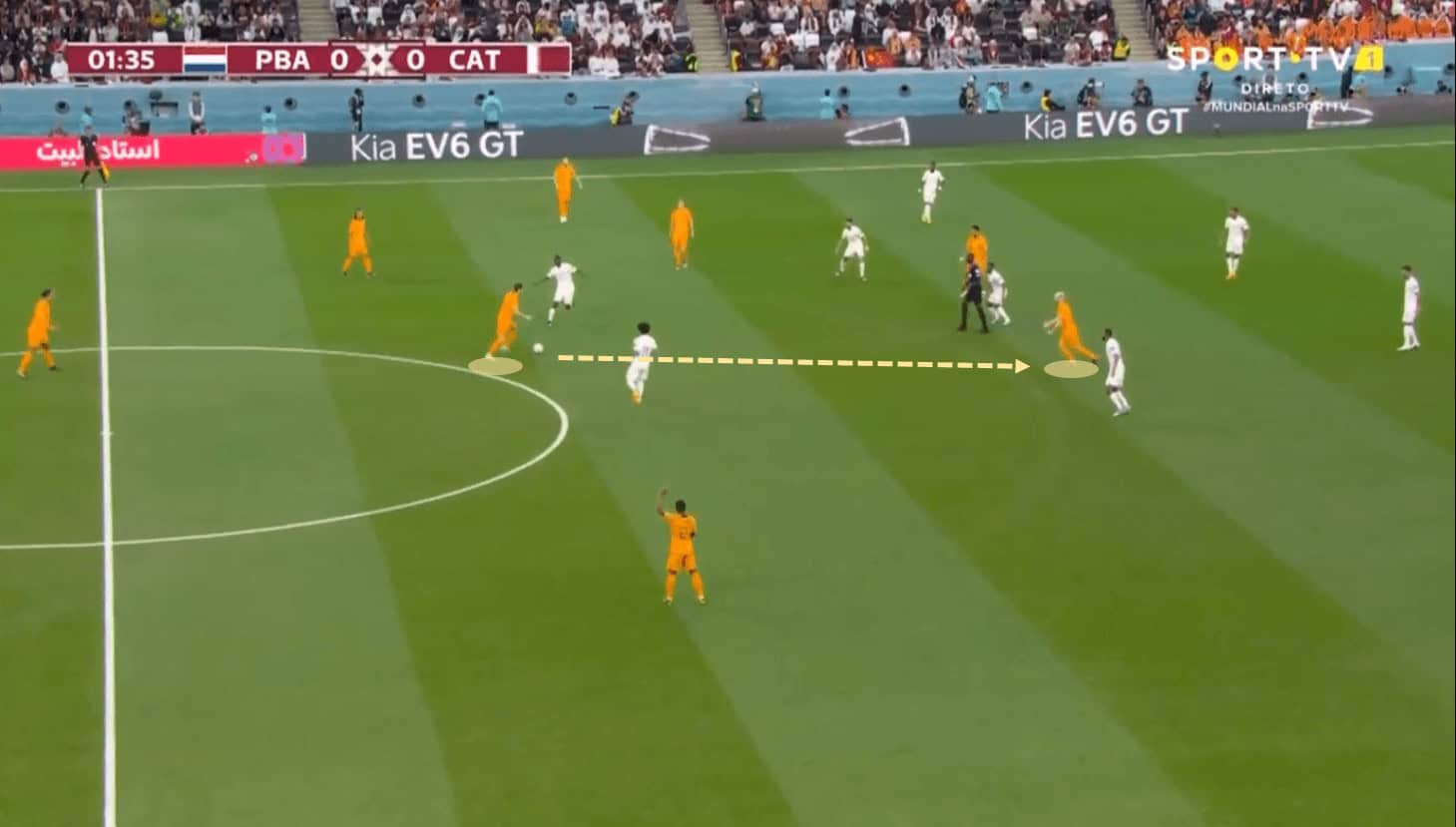 Frenkie de Jong, being an extremely vital player for Louis Van Gaal in different roles, was given one where he played the most solid, against Qatar, in which he could show more of his technique, ball progression and his excellent ball retention, as well as a fairly agile mind to decide the pass and keep advancing with supporting runs for his teammates.